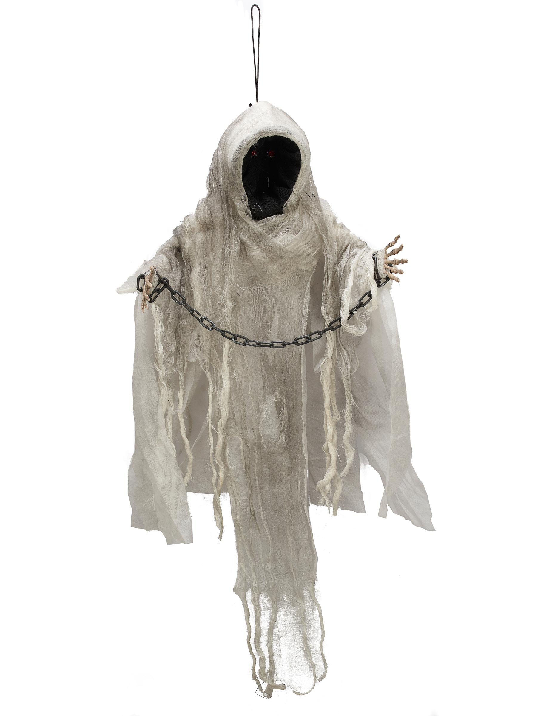 Този безличен безличен скелет ще виси. Той измерва приблизително 100 см и има метални рамки, за да може да ги позиционира, както желаете. Благодарение на 3 LR44 пъпки (не са включени), празните орбити на съществото ще запалят в червено по зловещ начин, за да усъвършенствате вашата атмосфера на Хелоуин!