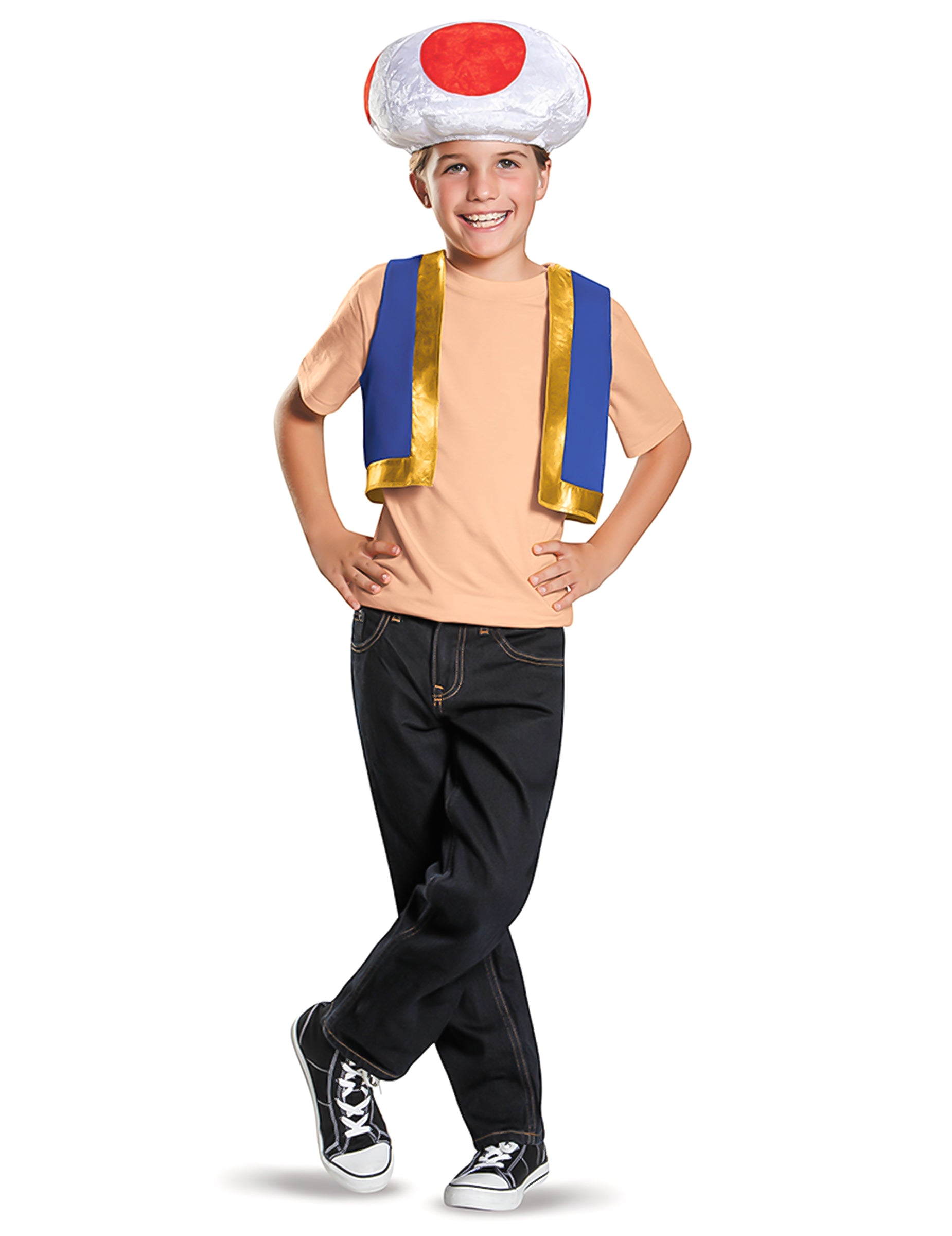 Този комплект за деца за деца под официален лиценз за Nintendo се състои от шапка и яке (тениска и панталони не са включени). Белите шапки с червени полка точки са във формата на гъбичка. Той измерва приблизително 40 см от кулата на главата. Якето без ръкави е късо в синьо и злато. С тази жаба детето ви може да въплъти най -известната гъба от Nintendo през следващата вечер по темата за видеоиграта. NB: Тази маскировка е подходяща за деца на 4 и +.
