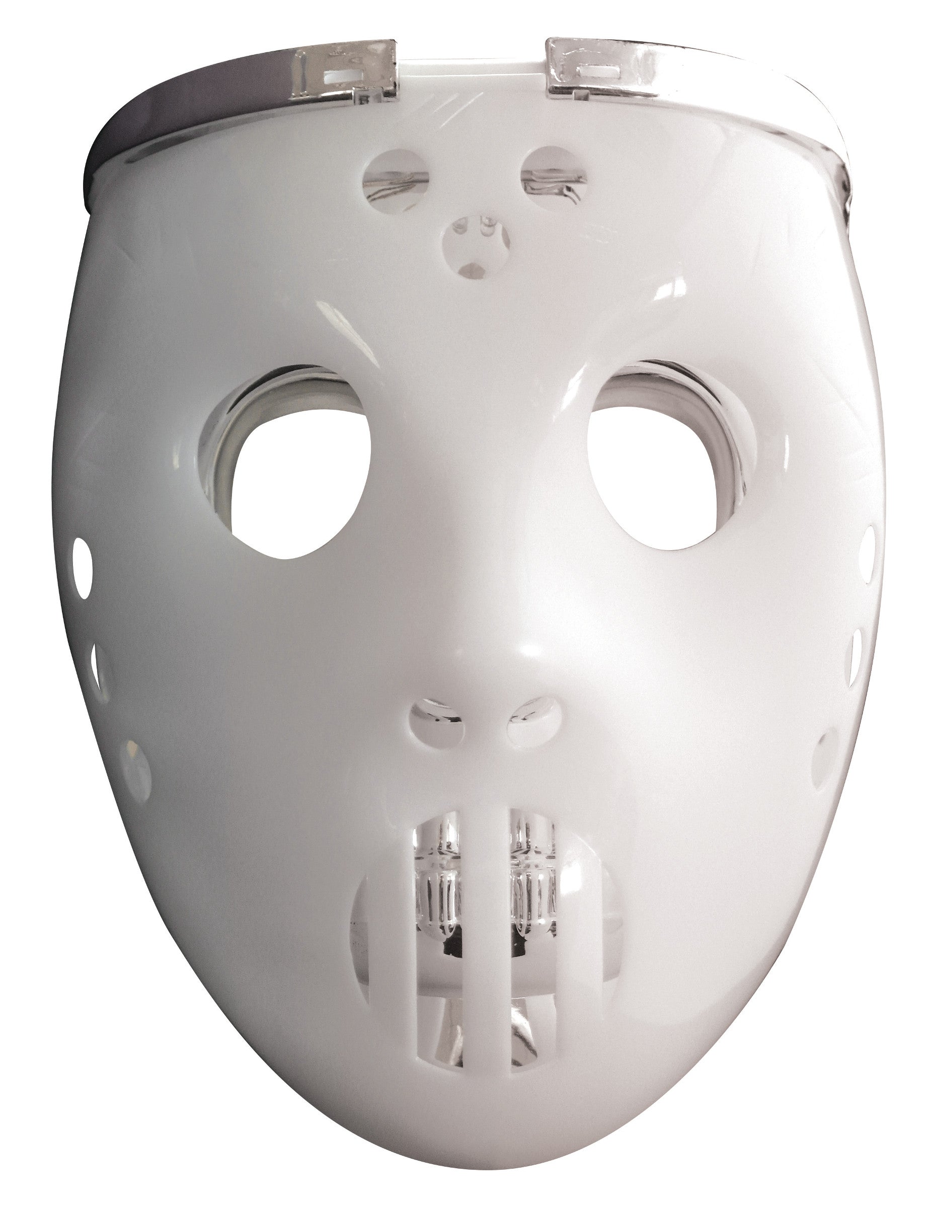 Тази хокейна маска е ярка и бяла (са осигурени 2 CR2016 батерии). Поддържа се от еластична. Дупките в очите, носа и устата ще ви позволят да дишате лесно. В допълнение, формата на маската и мрежата, която крие устата, припомня маската на известен убиец. Освен че е ярка, тази маска има особеността да скрие втора маска! Всъщност можете да вдигнете хокейната маска, а под нея се появява череп, който се появява! Този аксесоар ще бъде перфектен за завършване на вашите серийни костюми за убийци и да се страхува от живота им на приятелите си, по време на Хелоуин или парти, прикрита по темата за ужаса.