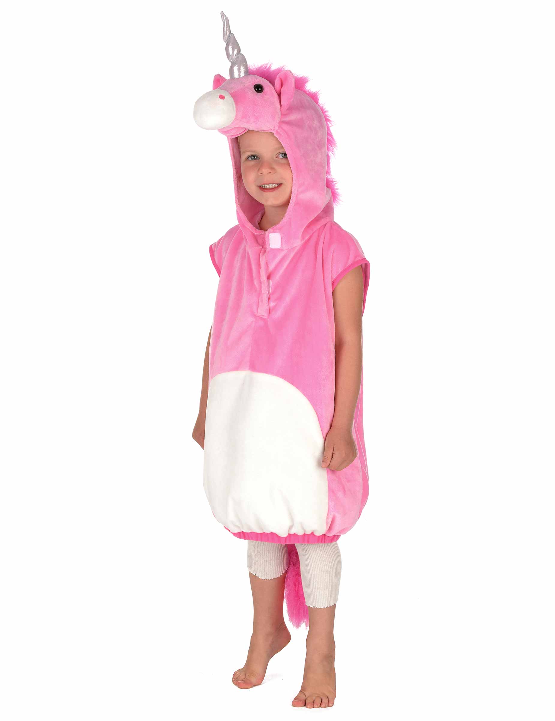 Тази детски маскировка на еднорог се състои от широк пуловер от плат, предизвикващ руното и подплатен с вата в корема. Качулката е украсена с превъзходна розова глава на еднорог със сребърен усукан рог. Манетата и опашката са в светлинни синтетични косми за плюшен ефект. Тази маскировка ще бъде идеална за това да направиш вашето дете да мечтае по време на първия му карнавал или за подарък за рожден ден.
