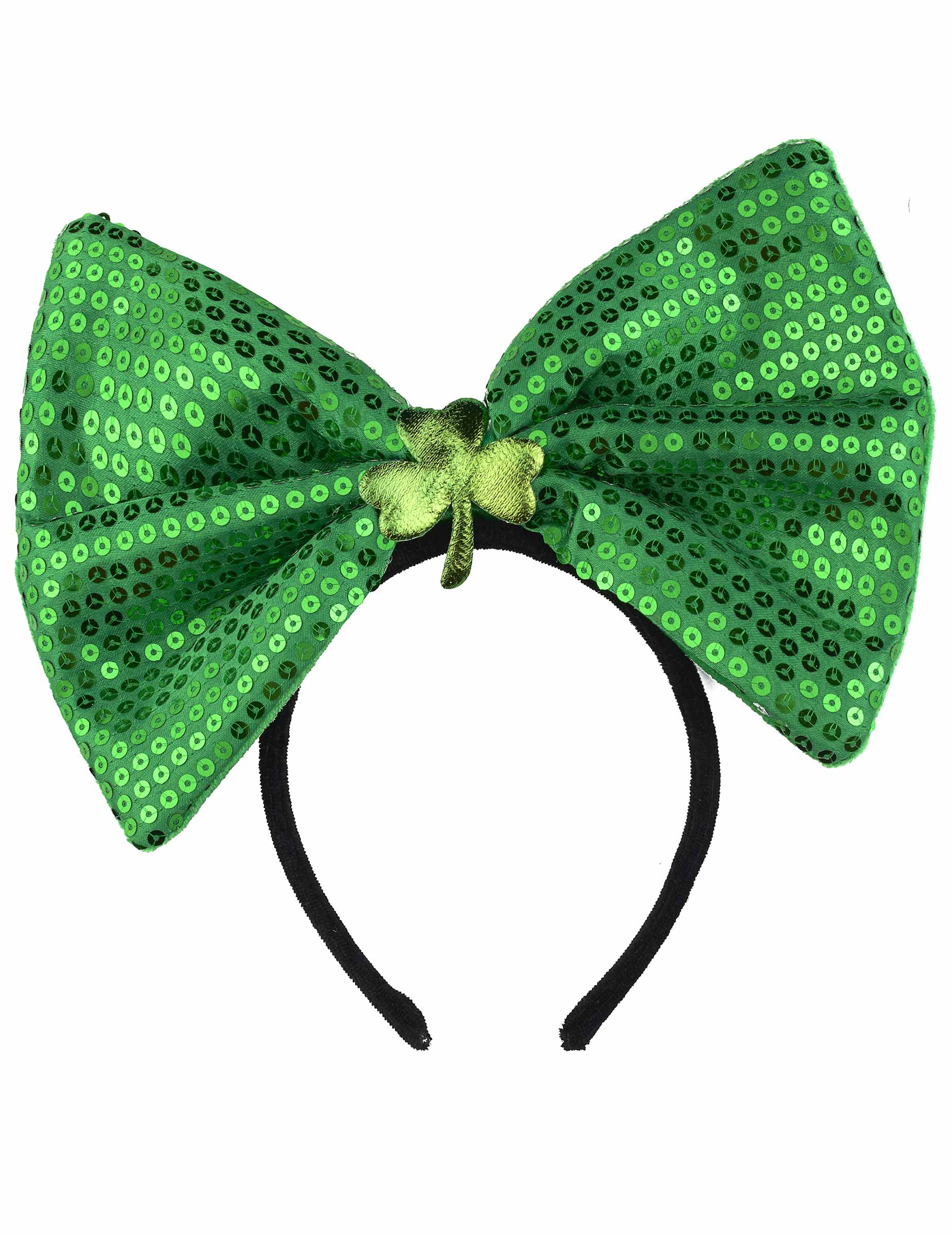 Тази лента за глава Сейнт Патрик е за възрастни. Тя включва мека оранжерия на главата, покрита с черна материя и преодоляна от голям зелен възел с лъскави пайети. В средата на възела е украсена със светлозелена детелина. За да завършите ирландската си маскировка и да маркирате повода по време на Сейнт Патрик, тази шапка ще бъде идеална!