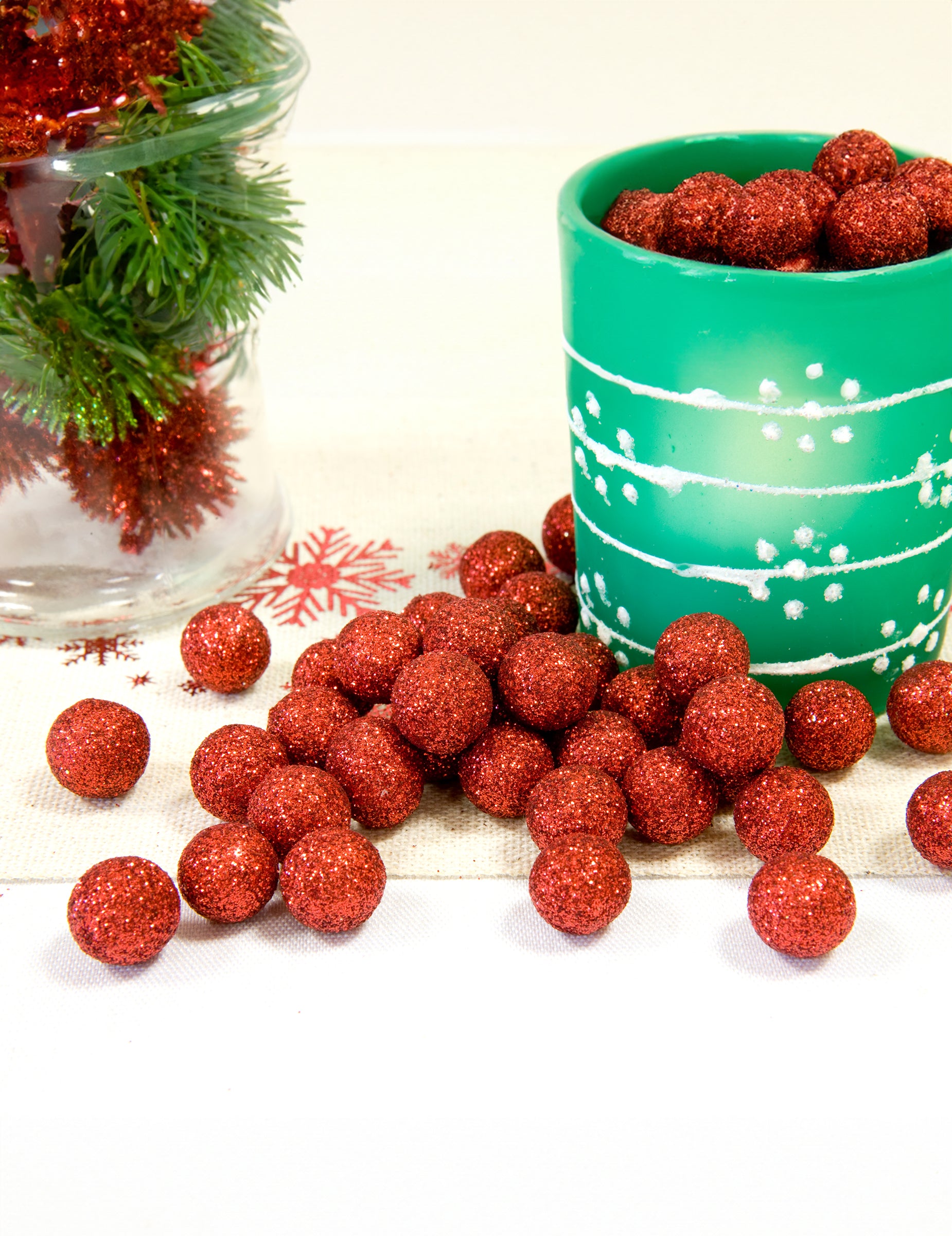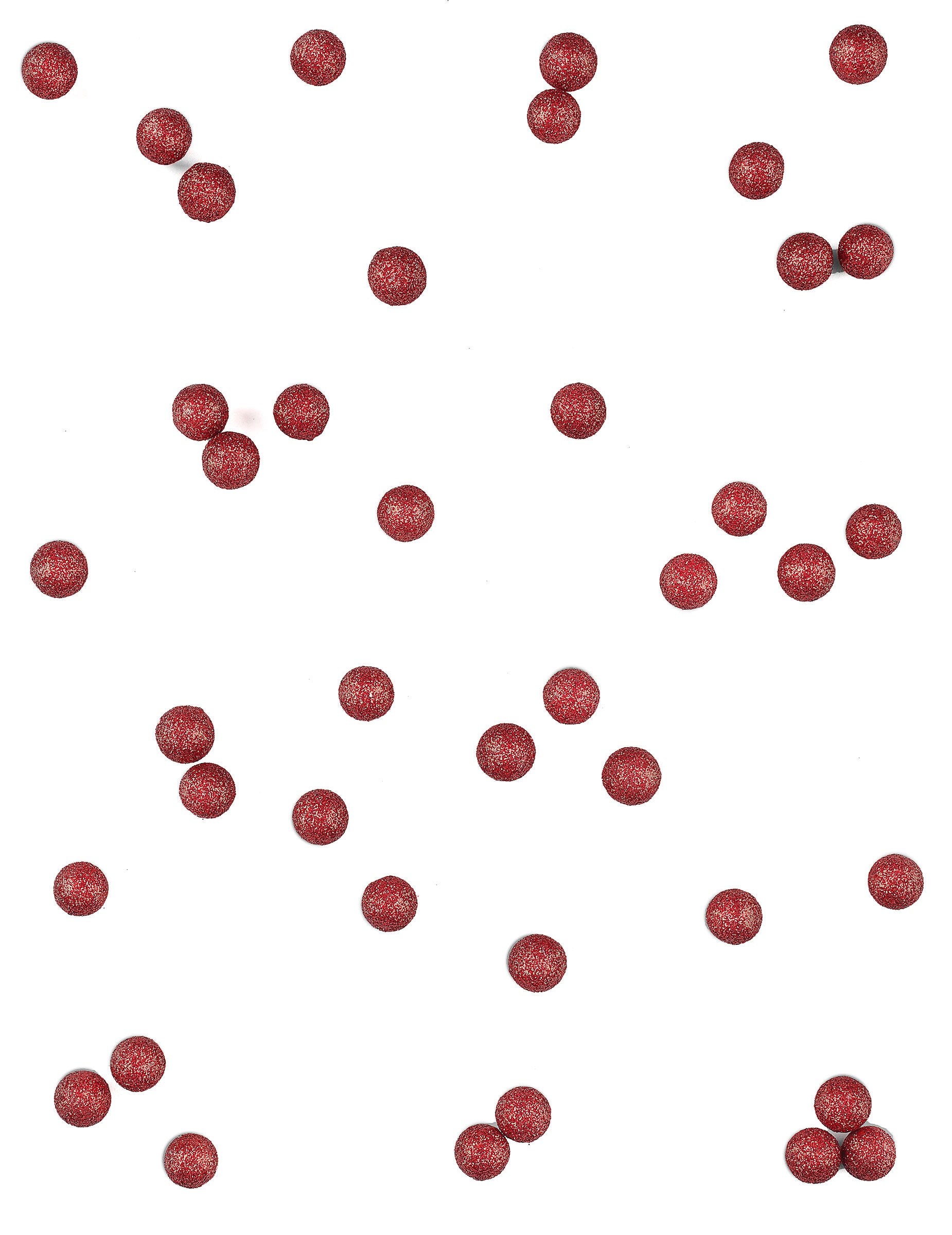 Тази партида от 40 малки декоративни топки е изработена от лека пяна. С диаметър 10 мм, те са украсени с червен блясък искрящи. Тези малки декоративни топки ще допълни перфектно вашето украса за маса За Коледа, А рожден ден или един брак.