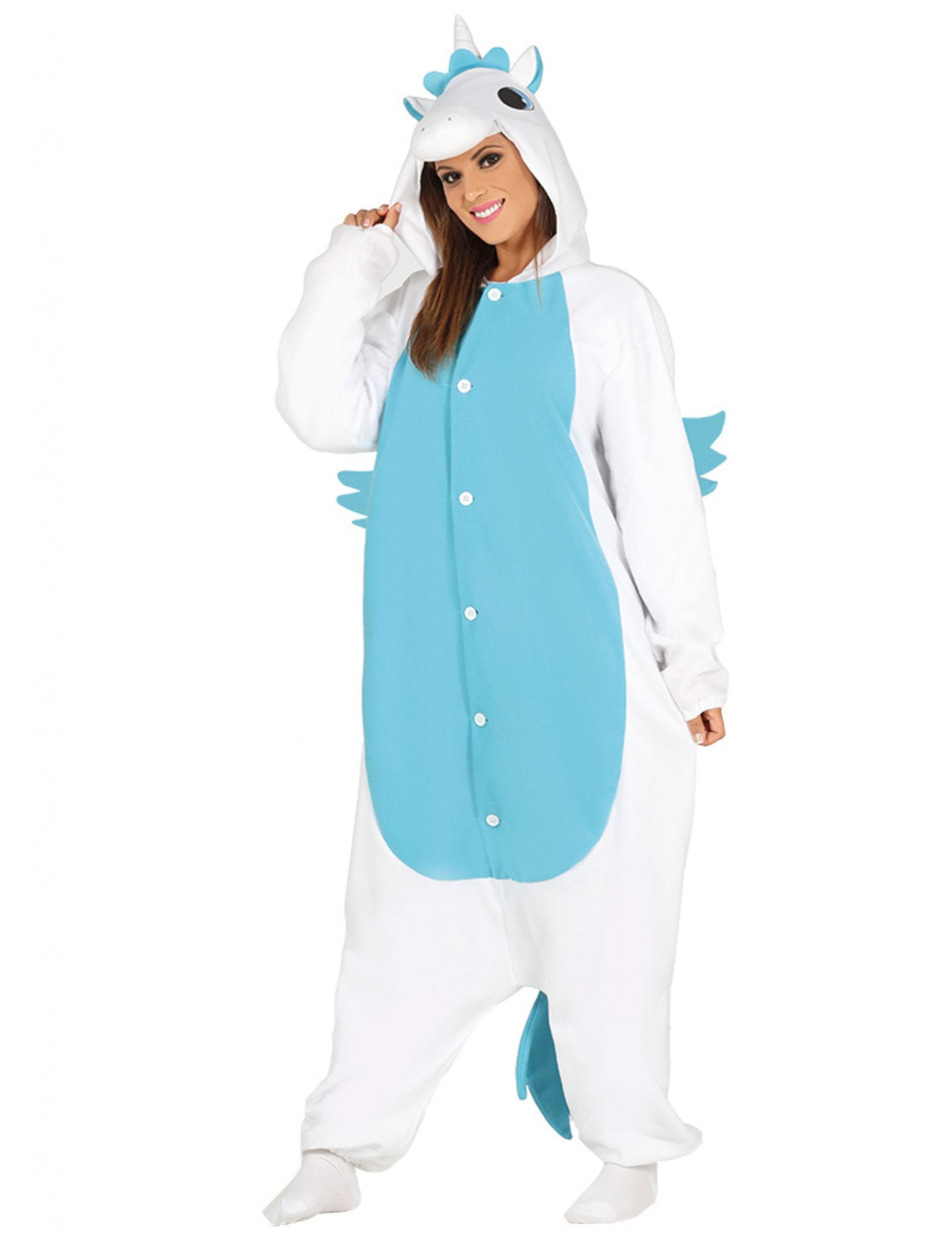 Тази маскировка за еднорог за възрастни се състои от голяма комбинация с качулка. Комбинацията от бял цвят със син корем се затваря с бутони отпред. Дълга опашка със синя коса. Качулката представлява главата на еднорог с големи сини очи. Този костюм ще бъде идеален за карнавал.