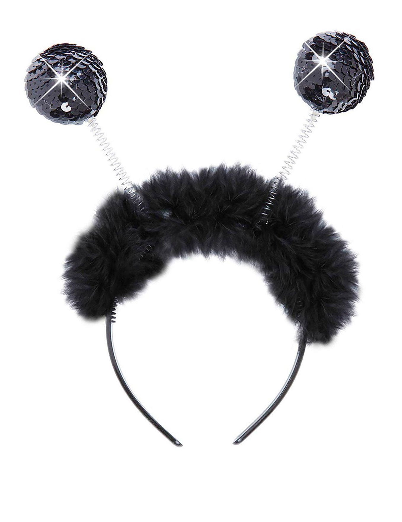 Тази лента за глава за възрастни е изработена от черна пластмаса. Иди горната част, тя е покрита с тъкан аспект черна козина за нежен стил! Освен това е декориран с две пролетни антени, преодолени от черни топки за пайети. Тази лента за глава ще може да аксесоари за вашите дискотеки, например по време на тема, Нова година или Карнавална вечер!
