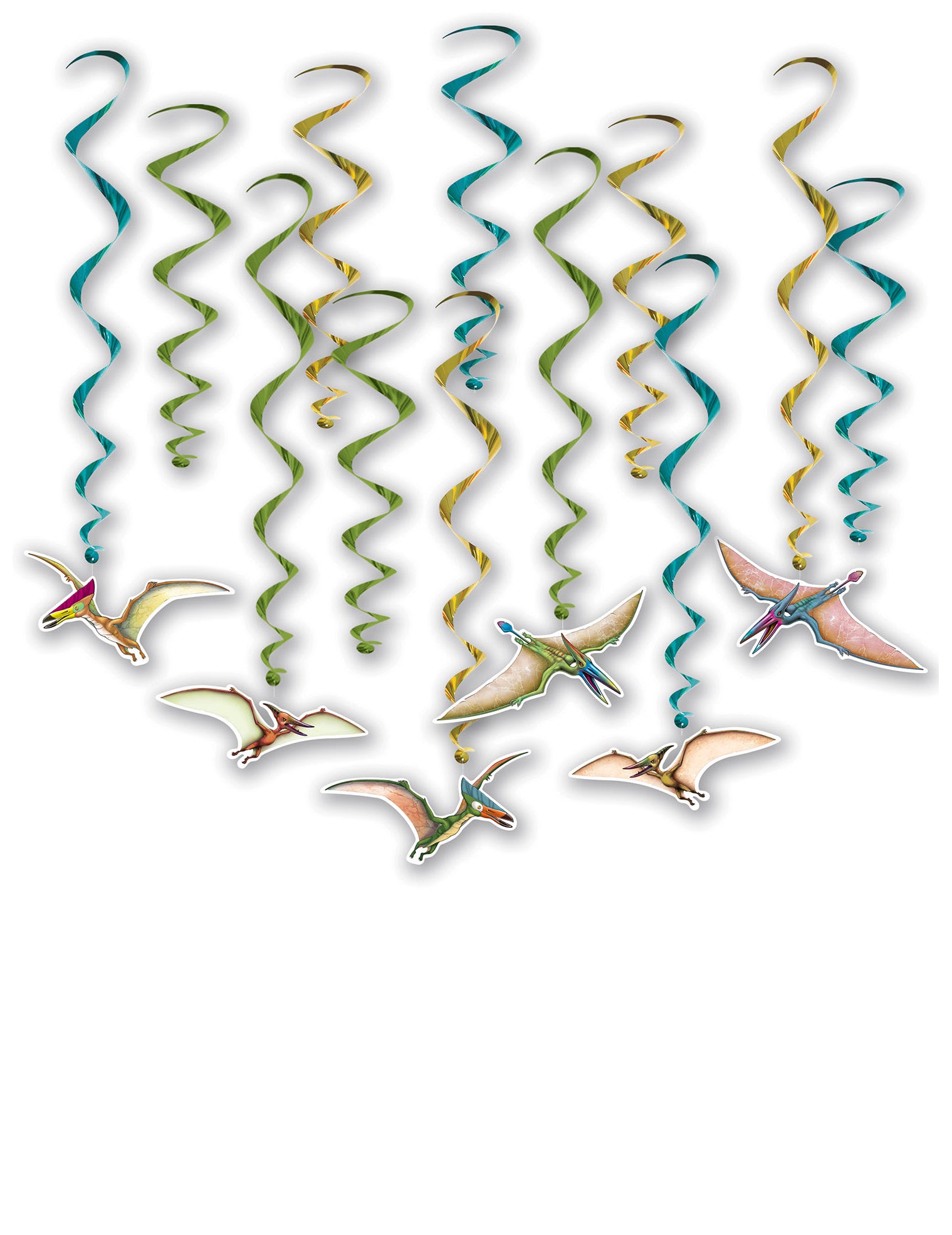 Тази украса е набор от 12 декорации за окачване на динозаври. Партидата включва 12 спирални суспензии. Те са направени в лъскав пластмасов лист, който може да бъде син, зелен или златист цвят. Долната част завършва с малък, отпечатан динозавър. Те измерват приблизително 43 cm x 81 cm. Тези 12 суспензии на динозаври ще подхождат идеално за украса на вашия дом в деня на динозаврите или праисторическа тематична закуска за рожден ден.