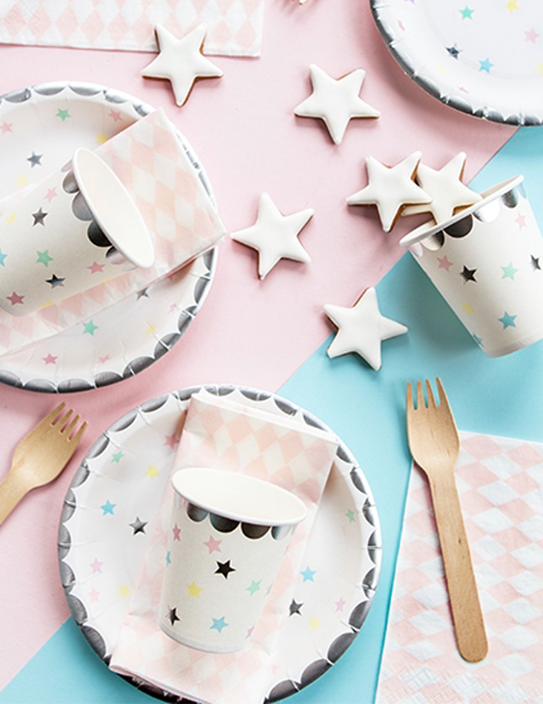 Добавете нотка магия към вашето събитие с този комплект от 6 картонени чаши с вместимост 180 мл. Всеки бял контейнер е красиво илюстриран смногоцветни звезди в пастелни нюанси, всичко това подчертано от елегантна сребриста фестонирана рамка. чаши Празничните предмети са идеални за подобряване на декорацията на вашата маса по време на рожден ден или един бебешки душ.