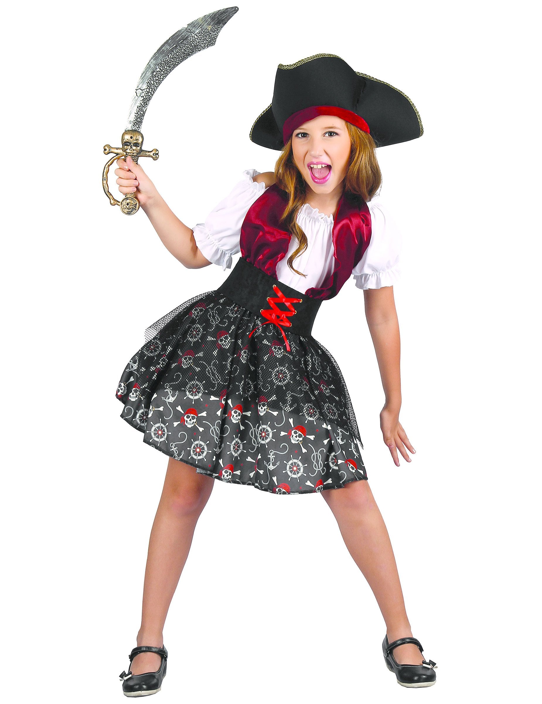 Тази пиратска маскировка за момиче включва рокля, колан и шапка (сабя и обувките не са включени). Роклята има много хубав отпечатък на череп и пират. Тя влиза в разпалена. Комплектът е с къси и подпухнали ръкави, черен колан от филц с фалшиво червено ласи трябва да бъде разположен в кръста. Гъвкавата шапка от пяна е черна на червен ръб и има превъзходна опора. Този пиратски пиратски костюм е идеален за влизане в обувките на доста пират по време на прикрито събитие като карнавал или тематичен рожден ден.