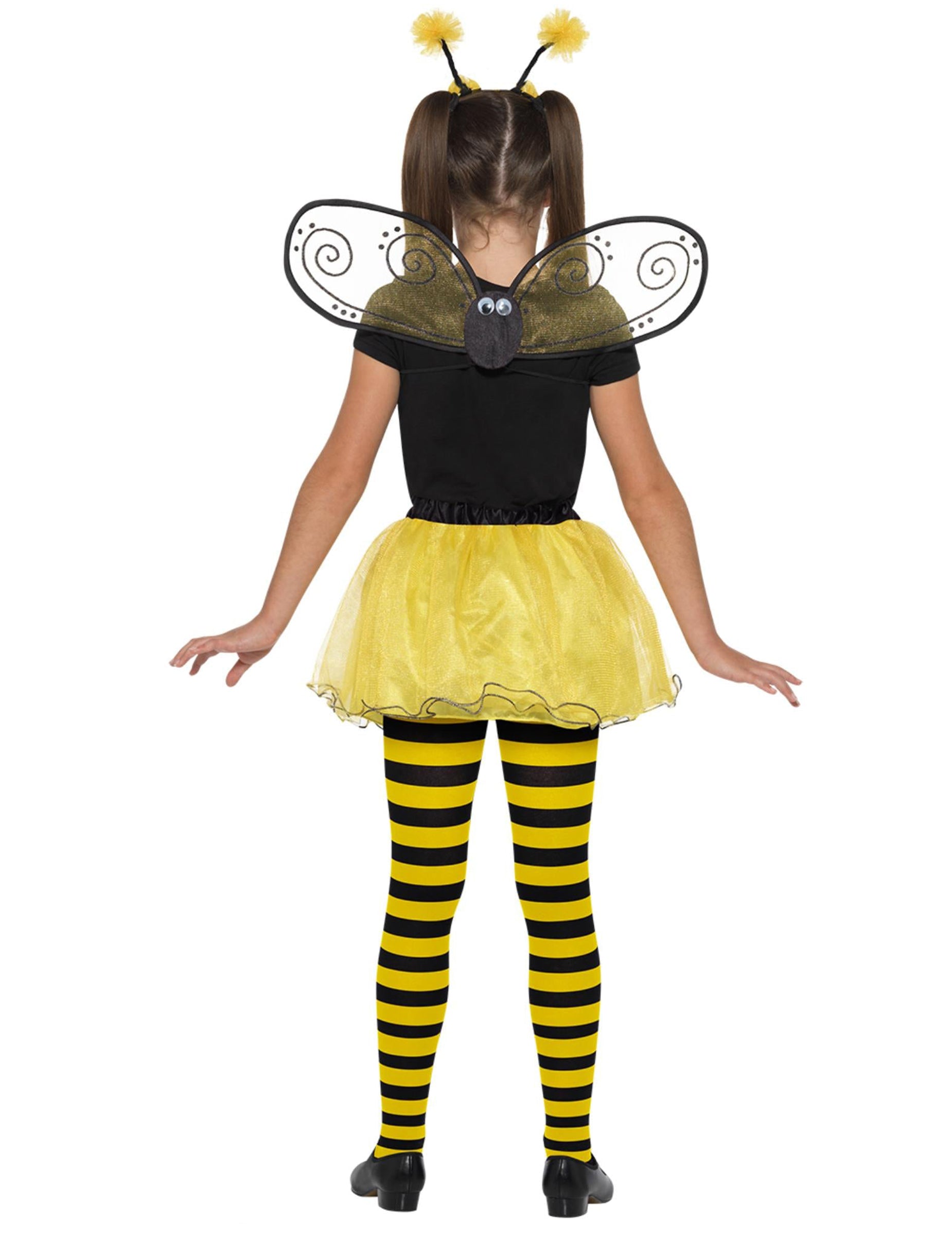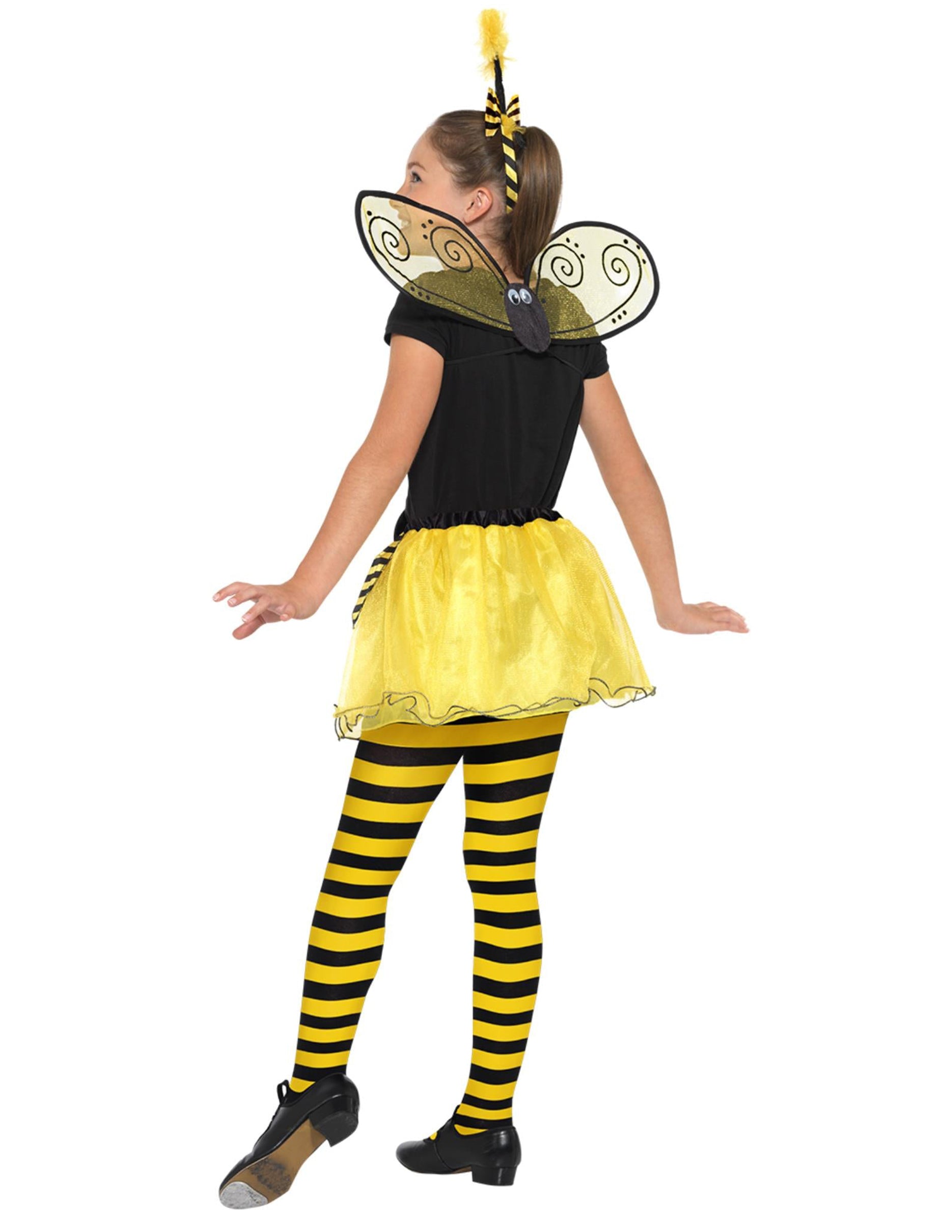 Този комплект Bee Bee включва лента за глава, чифт крила и туту. (Тениска, чорапогащи и обувки не са включени). Лентата за глава е съставена от панделки и две антени с жълта помпом в края. Размерът се регулира от еластичен декориран с черен възел на пеперуда и венчелистчета с жълти и черни ивици. Останалата част от туту е направена от черен тюл. Крилата завършват костюма. Този комплект Bee ще бъде идеален за карнавал или за парти по темата за природата и животните.