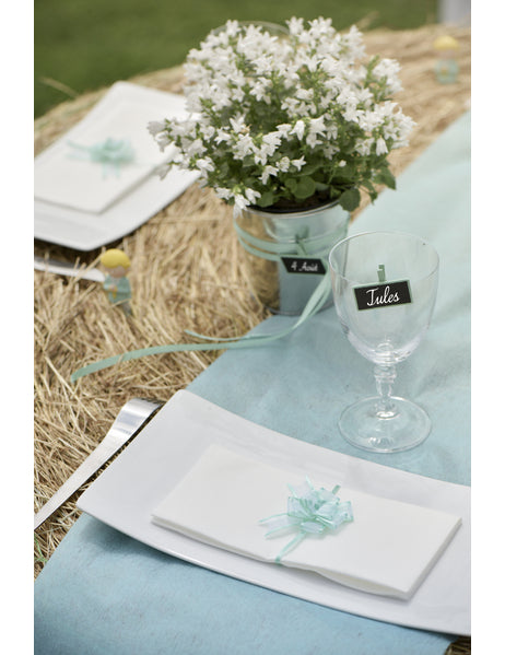 Този комплект съдържа 5 мини тюркоазени панделки Елегантни за вашите тържества. Изработени от сатениран органди в ярък син цвят, тези малки възли Изработени са от панделка с ширина 16 мм. Оформянето им е много лесно: просто издърпайте двете връзки на гърба, което ви позволява лесно да ги закрепите към избраната от вас повърхност. Тези аксесоари са идеални за украса на маса, кутии за подаръци или като оригинални пръстени за салфетки. Добавете нотка лекота към вашата... сватбена украса или кръщение с тези деликатни органдиеви орнаменти.