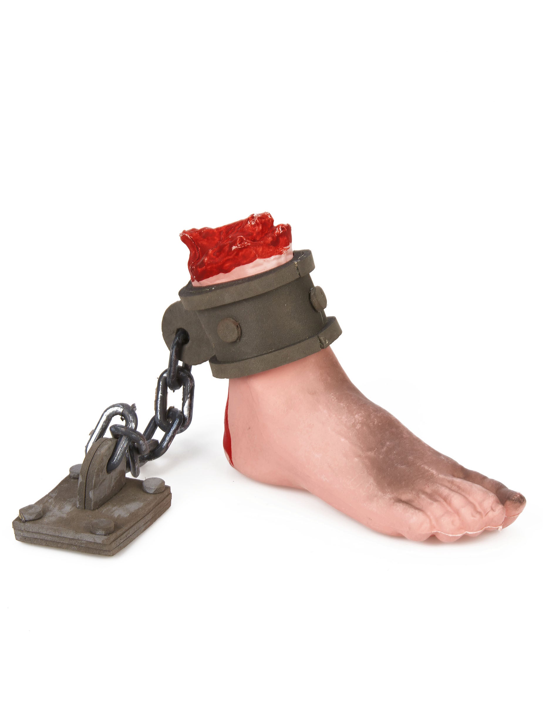 Тази декорация на Хелоуин е с дължина приблизително 15 см и 7,5 см широка. Той представлява нарязан крак с верига на глезена. Можете да украсите къщата си и да плашите гостите си с този кървав крак на Хелоуин.