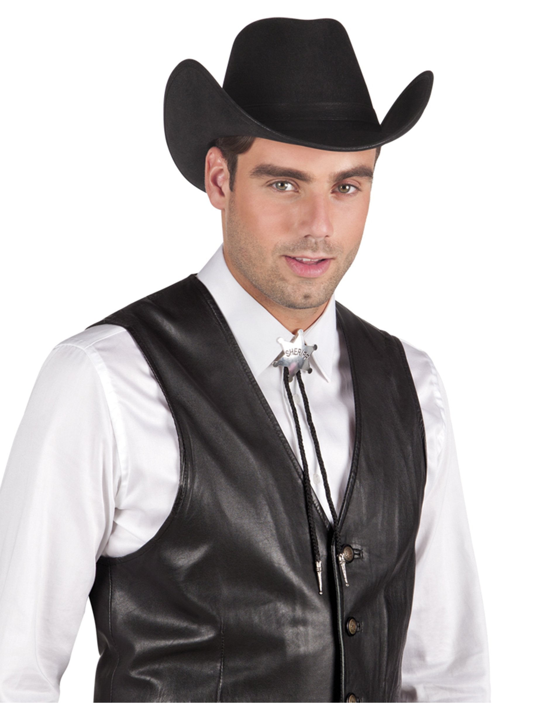 Този аксесоар е шериф колие за възрастни (шапка не е включена). Колието със своята сребърна метална шерифска звезда е съставена от черен шнур, полезен за регулиране на звездата, както желаете. Краищата на шнура също са изработени от метал. Това колие шериф е идеално за завършване на маскировка по време на вечер по темата на Далечния Запад или за карнавала!
