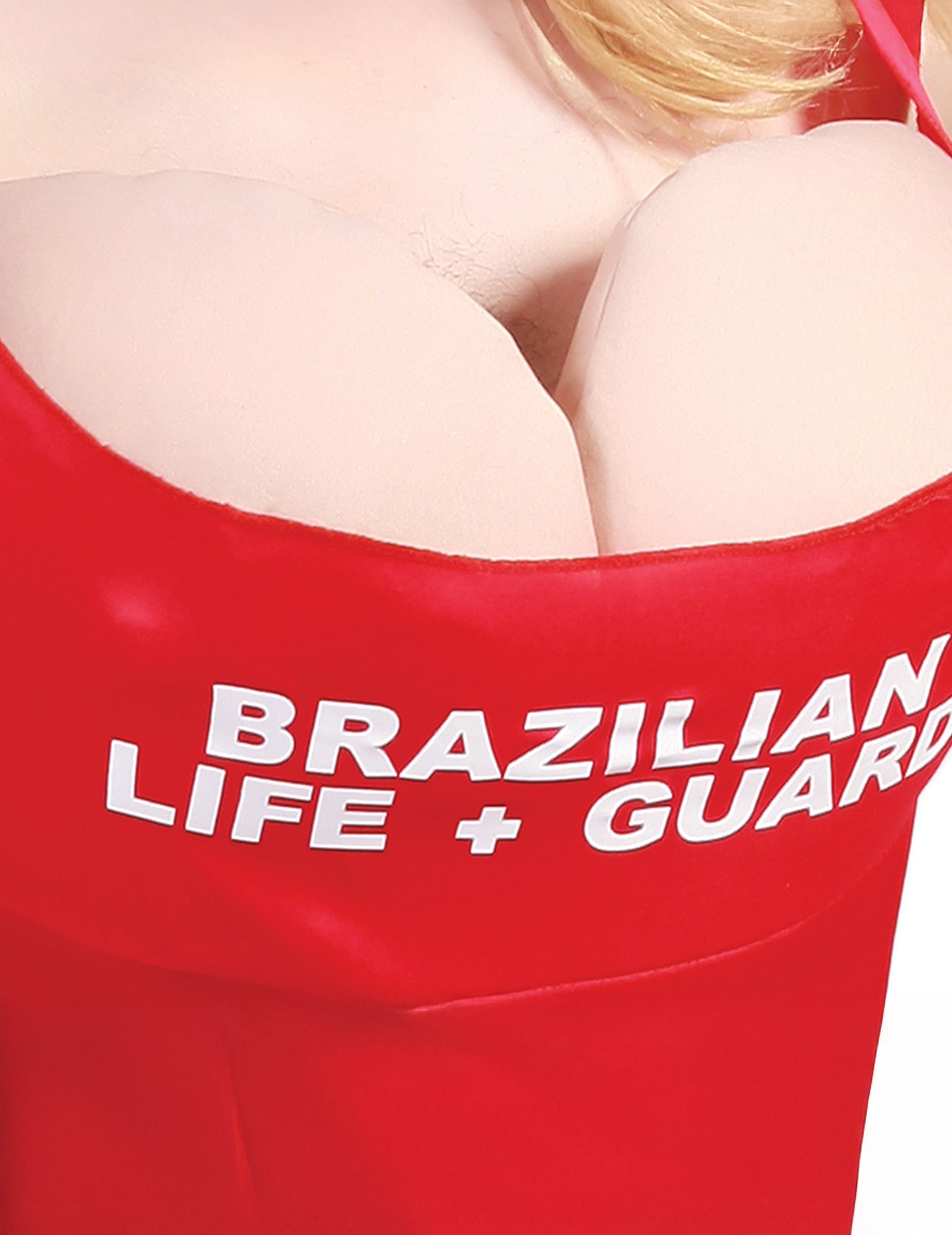 Този мъжки костюм представлява бански костюм на известната Памела Андерсън в хумористична версия. Тя включва комбинация. Комбинираната с плът, оцветена е украсена с червен бански костюм с надпис „Бразилският живот на живота“, отпечатан на гърдите. В тази доста комбинация са включени кичур коса, напускаща фланелката и особено голям сандък. Станете звездата на вечерта с този хумористичен костюм по време на прикрита вечер, парти по темата за предупреждение в Малибу или за друго празнично събитие!