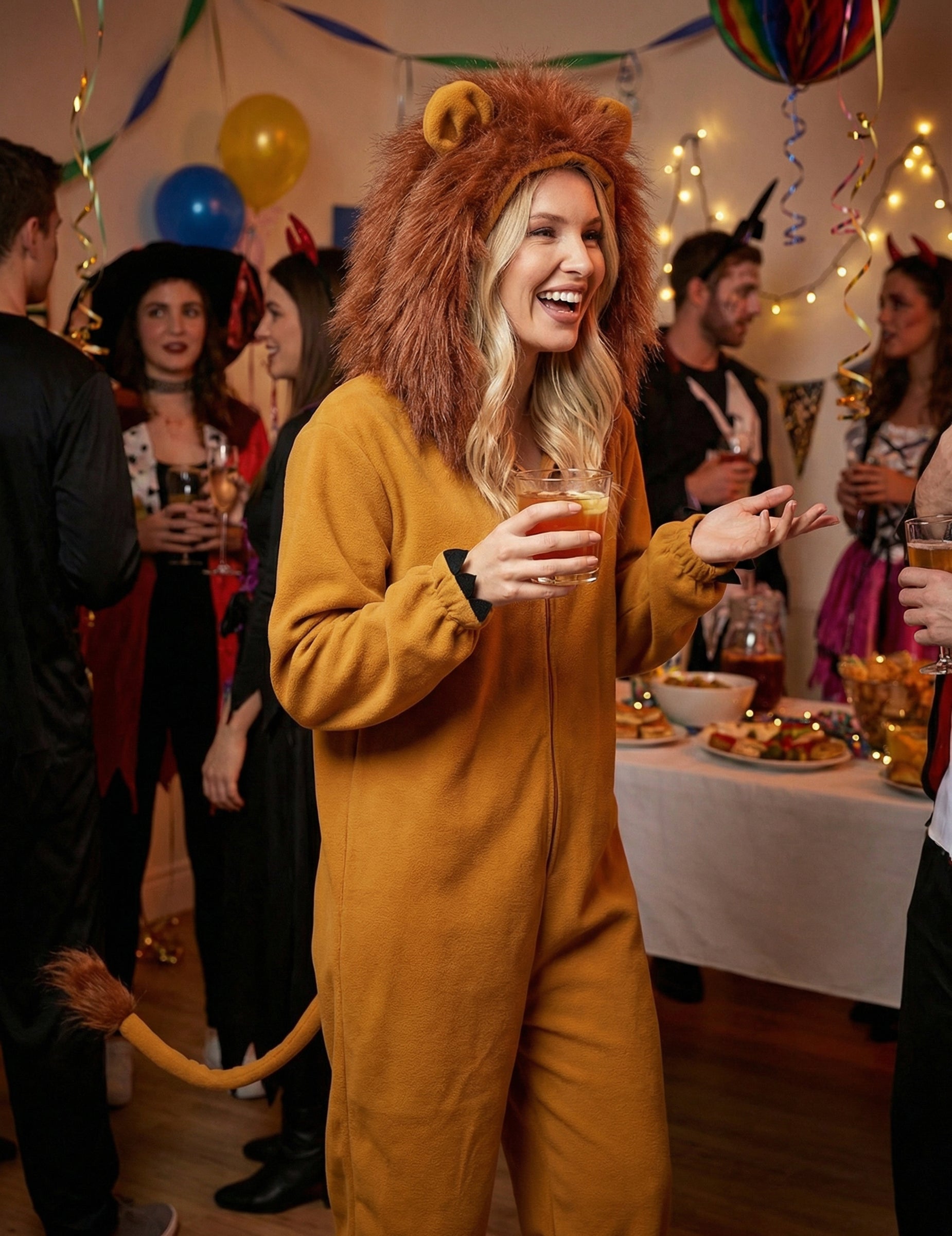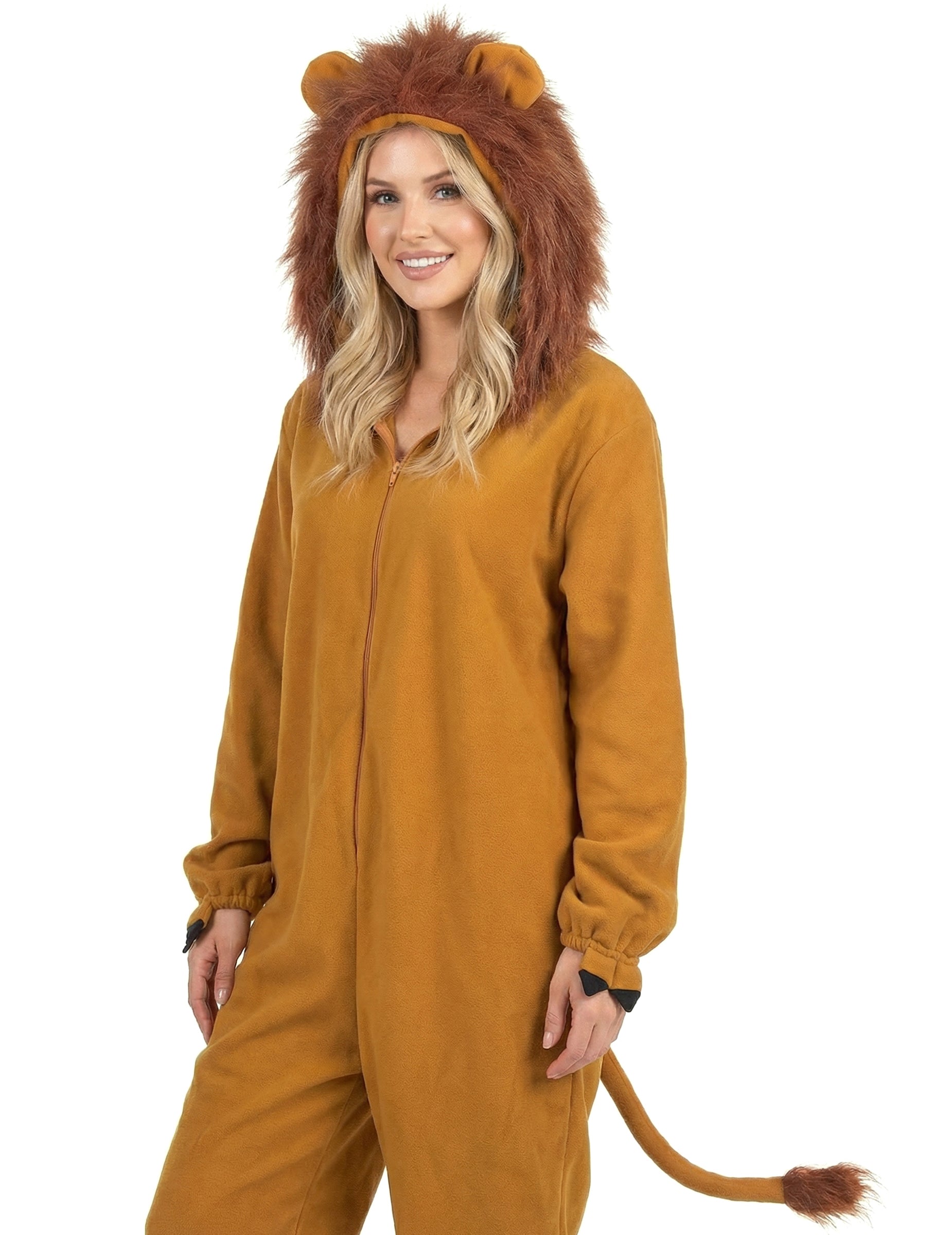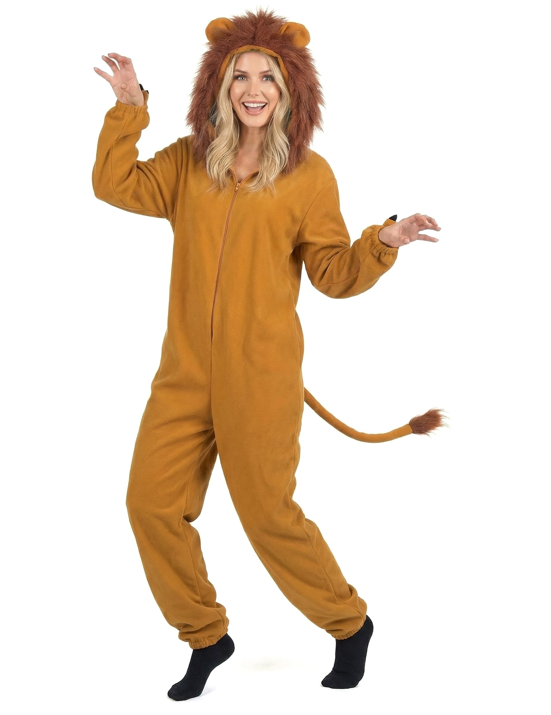 Този костюм на Lioness за жени е приятна комбинация за носене на затваряне отпред чрез леко затваряне (чорапи не са включени). Материята от руно Fawn ще бъде удобна за носене. Комбинацията е оборудвана с качулка с уши и особено пламтяща грива във изкуствена козина. На гърба ще намерите опашка, завършваща с кичур коса. Краищата на краката и ръкавите са еластични, за да получат комфорт и работа. Готови да извадите вашата дива страна, фалшиви нокти на китките ще ви помогнат да парадирате като лъвица в савана! Този костюм на Lioness ще бъде идеален за карнавал или за вечер на тема на животните!
