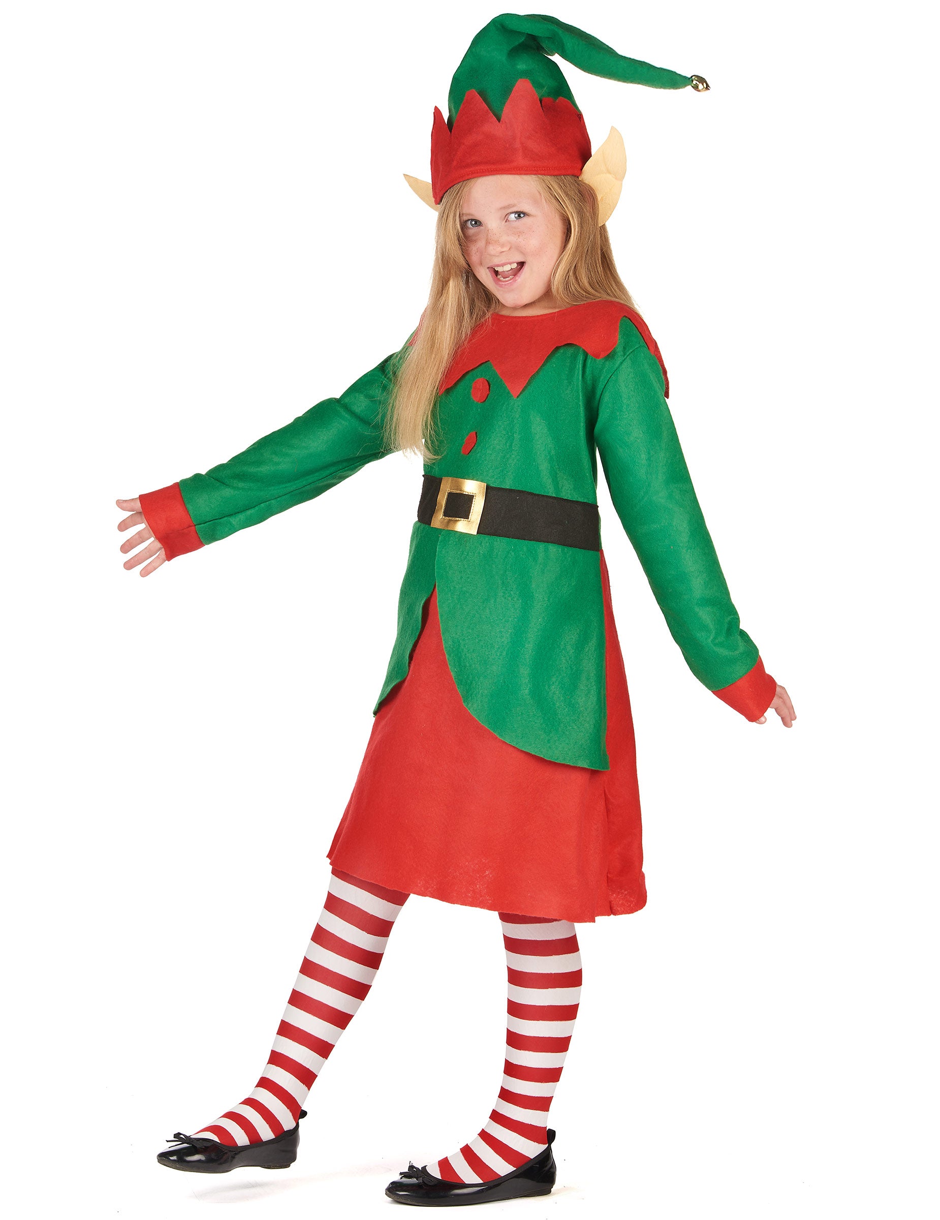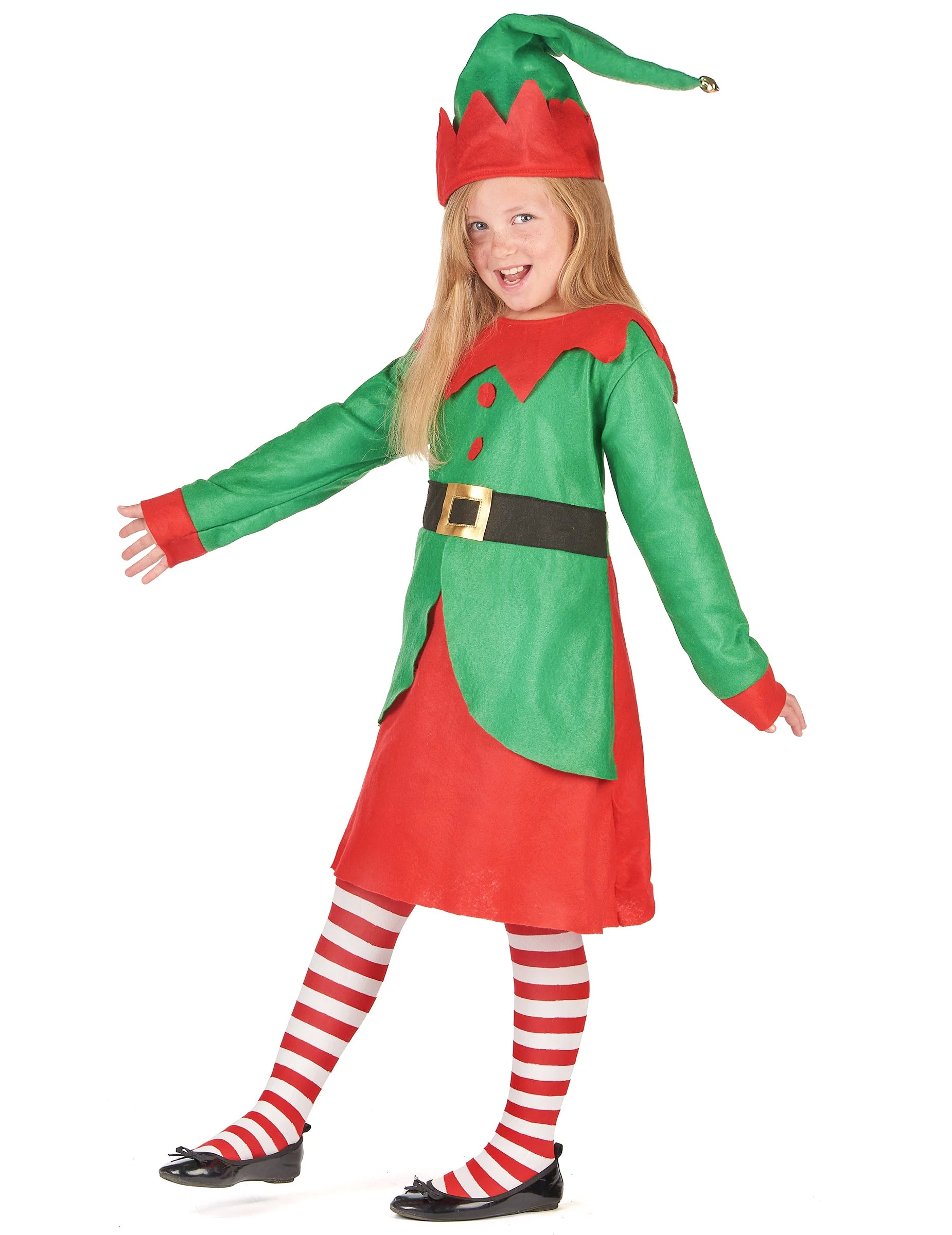 Този костюм за коледен елф за момиче се състои от рокля и шапка. Роклята на елфите е зелена отгоре и червена на дъното. В кръста присъства черен колан, само отпред. Тази рокля се затваря отзад с помощта на драскотини. Елфската шапка е зелена и червена. Той има малка златна камбана на върха, за да пресъздаде магията на Коледа. Този костюм на елфи ще бъде перфектен за придружаване на Дядо Коледа в разпространението на подаръци за Коледа.