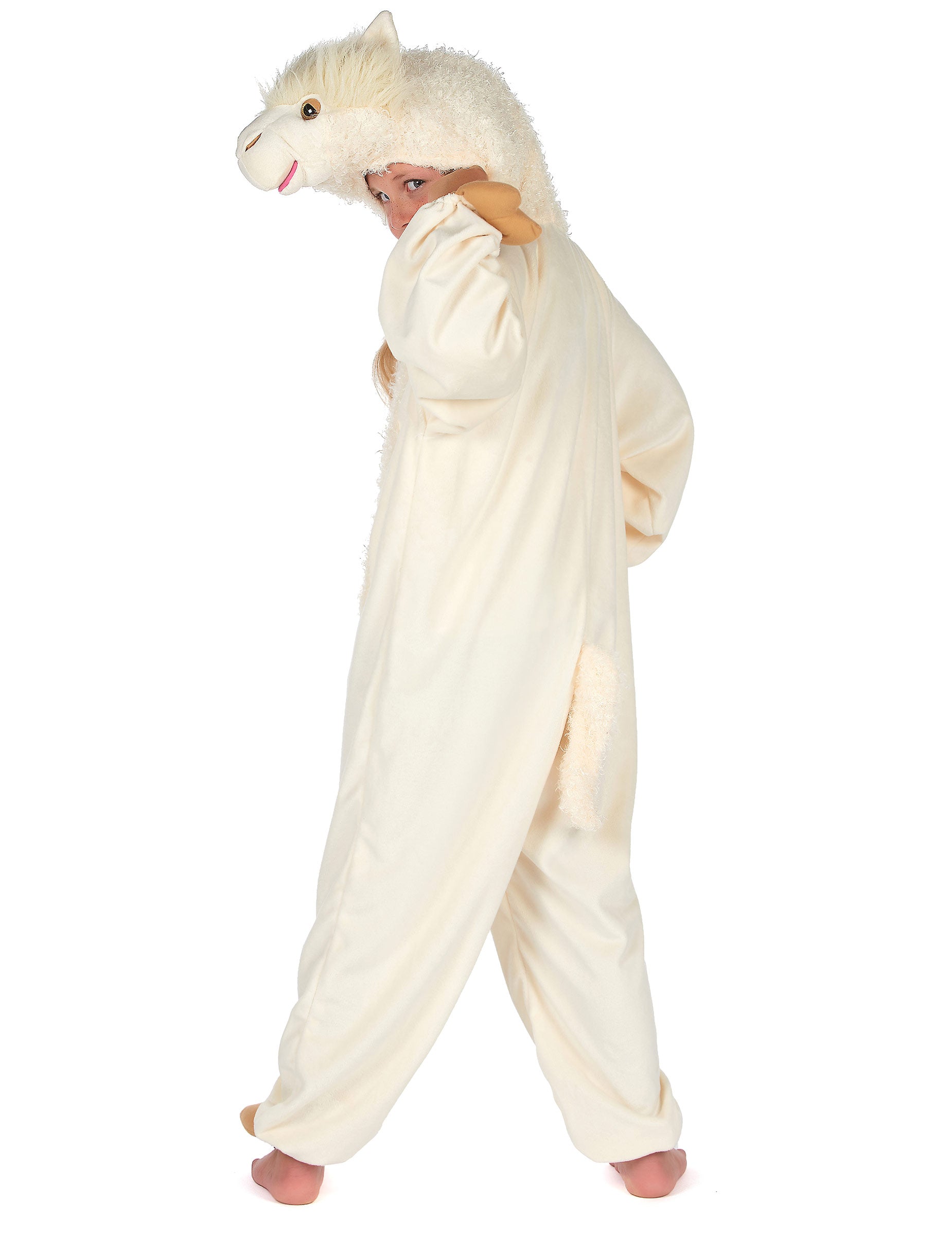 Този детски костюм на лама включва гащеризон с качулка.
