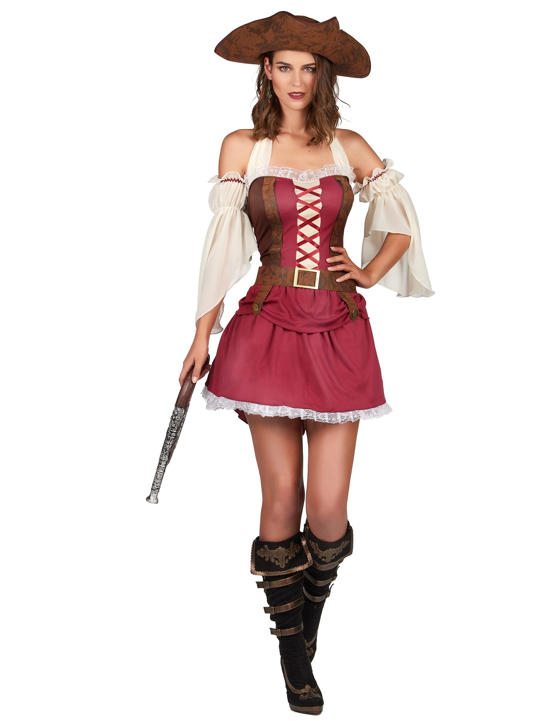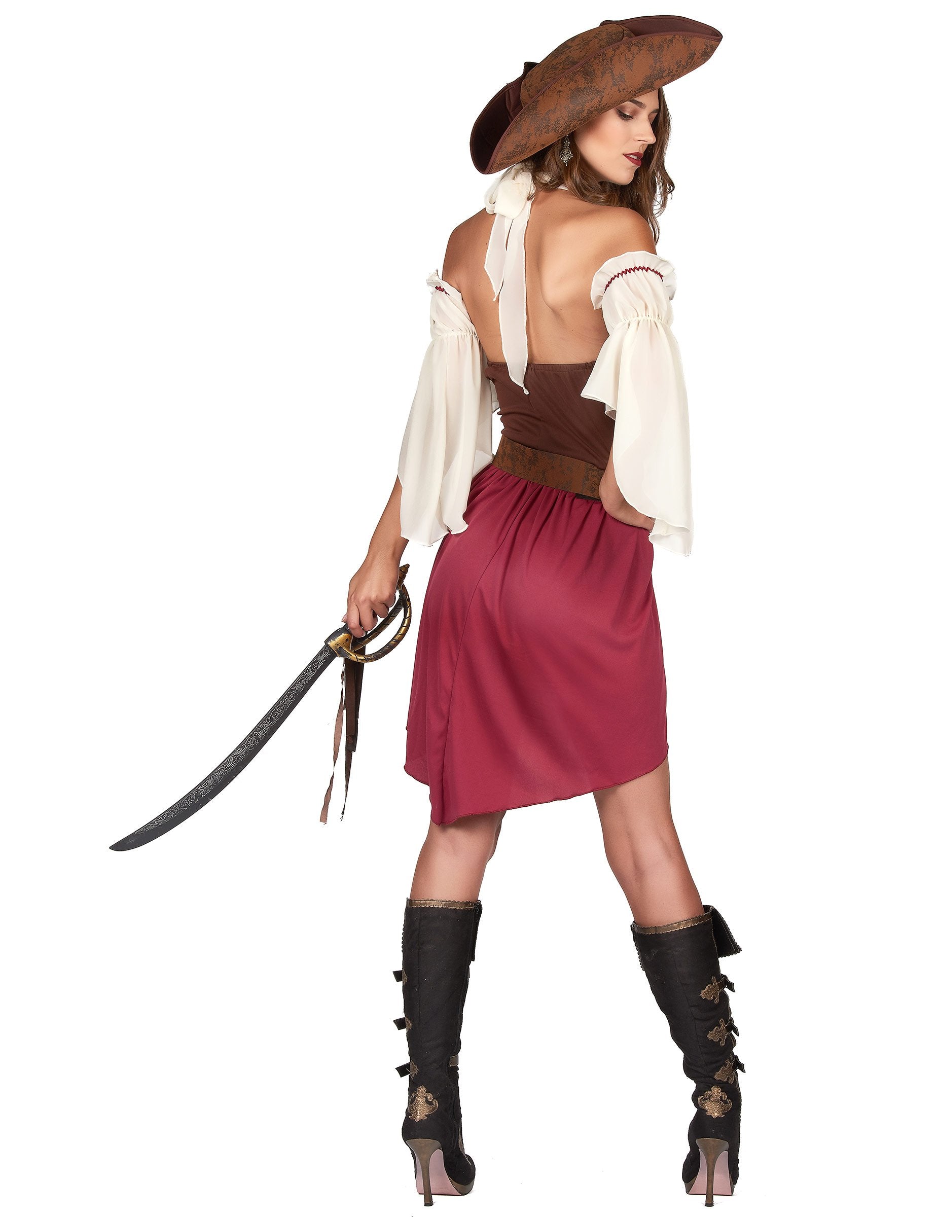 Тази пиратска маскировка за жени се състои от рокля, колан и шапка (ботуши, маншети и пистолет не са включени). Голата рокля на гърба е бордо и къса. Той има бордо, граничещ с бял фон. Страните на роклята са кафяви на бюста. Отпред дъното на роклята е оградено от имитация на бяла дантела за качествено покритие. Гърбът на роклята е кафяв и бордо, гърбът на роклята е по -дълъг от предната част. За да аксесоари за вашия тоалет, можете да поставите кафявия колан със сребърен цветен контур, осигурен за вас, около вашия размер. Кафява шапка, типична за пират, ще завърши прикриването. Този секси пиратски костюм за жени ще бъде идеален за вечер, прикрита на темата за пирати или за карнавал!