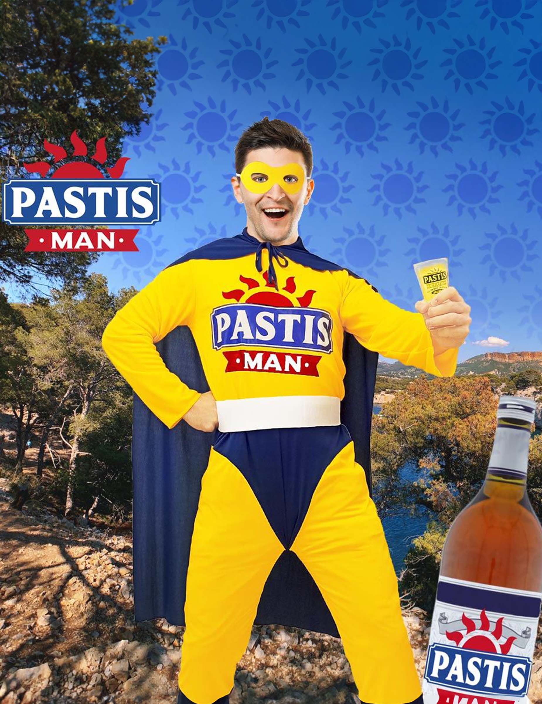 Този костюм на Super Pastis Man се състои от комбинация, нос, маска и колан (чаша не е включена). Цветовата комбинация Pastis е дълга доза Dotèe, синя чорапогащник се отпечатва върху комбинацията, за да усъвършенства вашето облекло за супергерой. На бюста е отпечатано лого на "pastis man". Белият колан ще подчертае красиво маскираната ви бдителна конструкция. Синият нос е прикрепен около шията с помощта на връв и ще осигури приятен ефект, когато влезете в вечерта. Вълкът Pastis Color ще бъде използван за прикриване на вашата идентичност като аперитиф супер hèros! С този костюм на Super Pastis Man повече никой не може да умре от жажда през следващите вечери, прикрити по темата за хумора или на темата за супергероите.