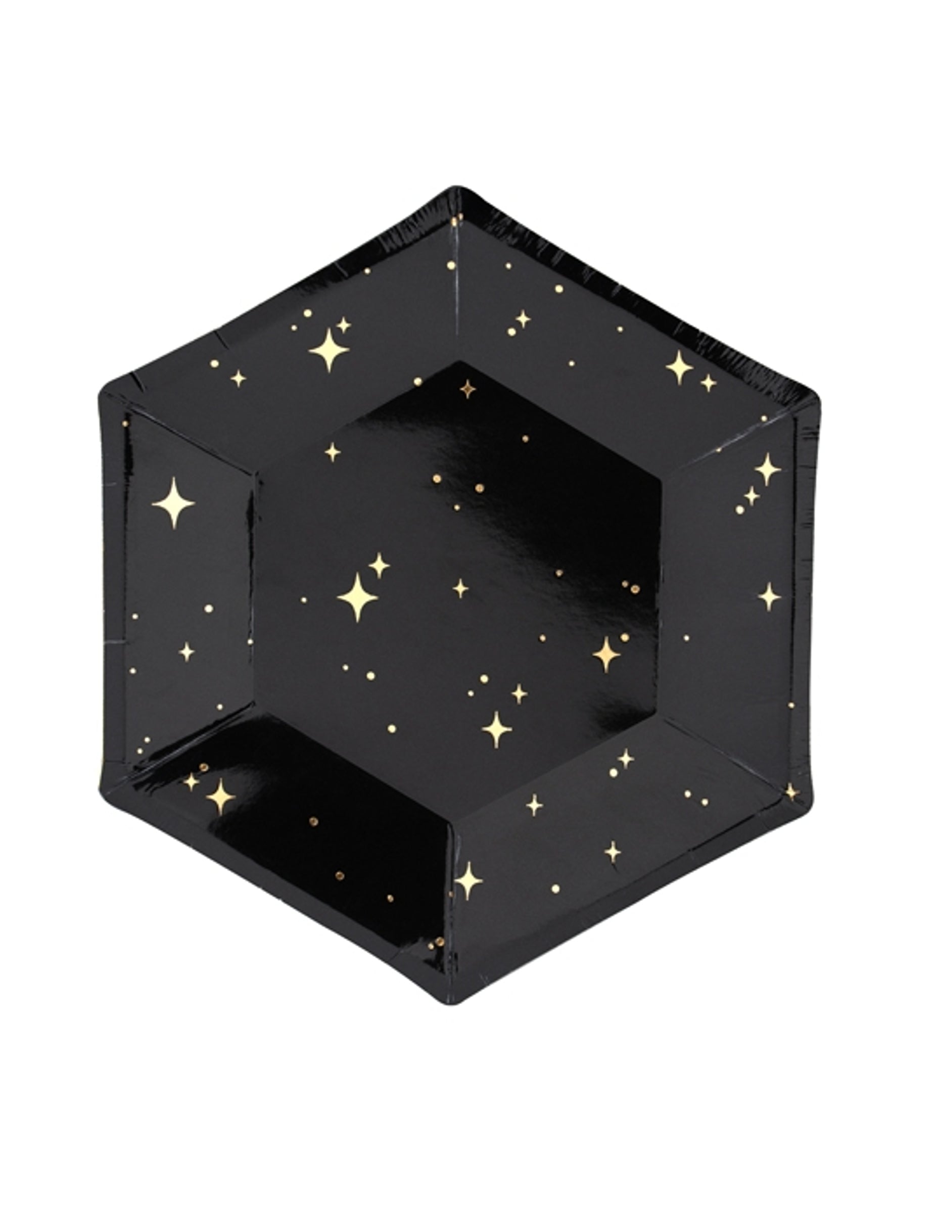Ce lot comprend 6 assiettes en carton de forme hexagonale. D'un diamètre d'environ 20 cm, elles arborent un fond noir élégant parsemé de petites étoiles dorées de tailles variées. Ces assiettes jetables sont l'accessoire idéal pour composer une table chic lors d'une fête de nouvel an ou pour célébrer un anniversaire avec éclat.