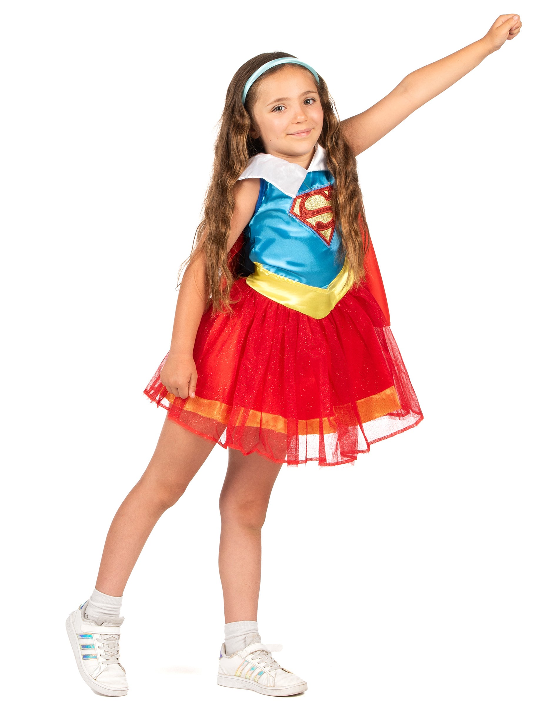 Този костюм на Supergirl е официално лицензиран DC Super Hero Girls. Той разполага с рокля с нос и лента за глава. Лентата за глава е светлосиня на цвят. Ще бъде идеално да носите на главата си! Кратката рокля без ръкави е сатенено синьо на бюста с логото на блясъка на Супермен и Супергирл в центъра на гърдите. Бяла яка е пришита за роклята, както и късият червен нос. Имитационният жълт V-образен колан също се пришива за роклята. Накрая, дъното на роклята е блестящ червен тюл туту, облицована с червена пола от плат, оградена от лента от жълта тъкан. Този костюм на Supergirl, супергерой от DC Super Hero Girls, ще зарадва дъщеря ви по време на карнавала или рожден ден с тематика за супергерой.