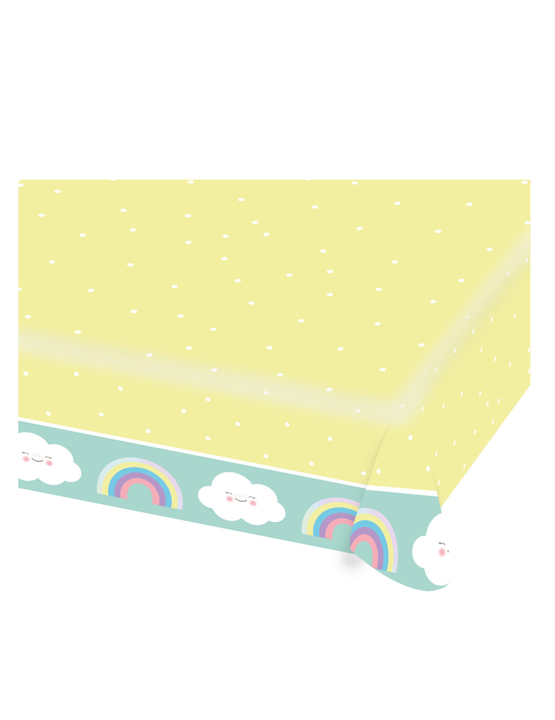 Son design coloré propose un centre jaune à pois blancs, tandis que ses bordures menthe sont joliment illustrées de nuages et d'arc-en-ciel.