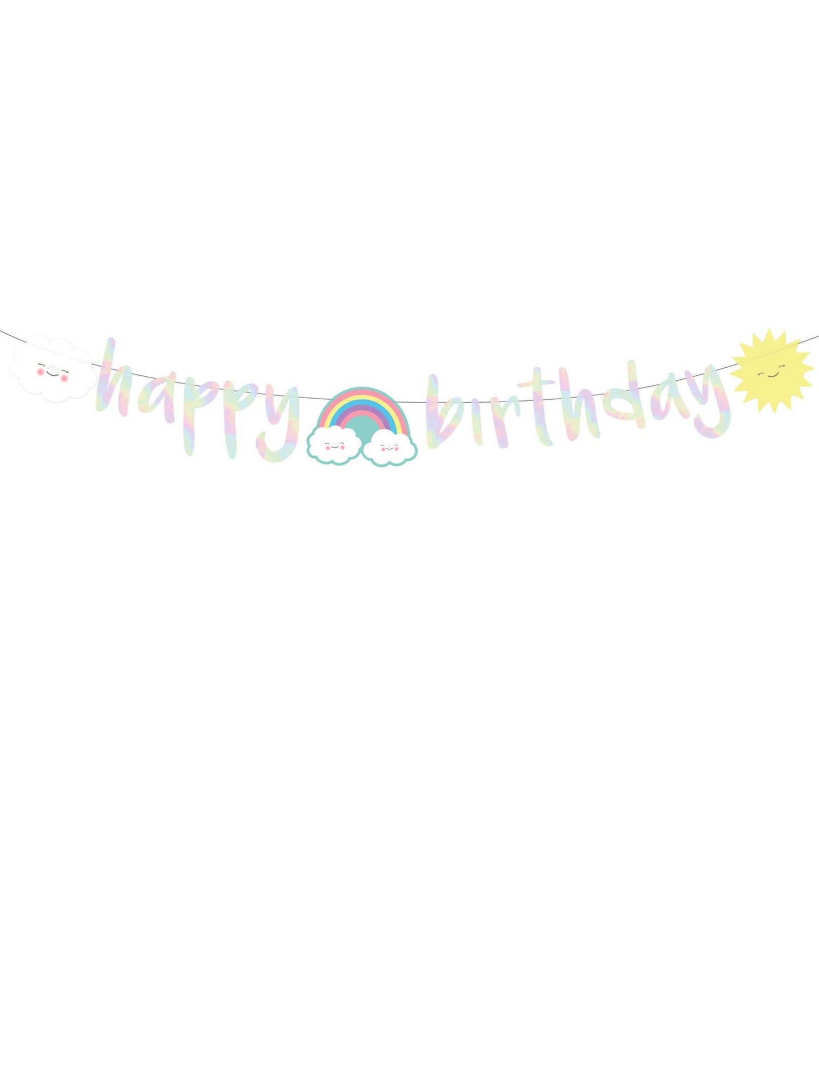 Apportez de la féerie à votre fête avec cette guirlande d'anniversaire en carton mesurant 180 cm. Elle se compose de fanions irisés formant le message "happy birthday", complétés par des motifs de nuage, soleil et arc-en-ciel. Cette guirlande est l'accessoire idéal pour décorer la salle lors de l'anniversaire d'un enfant.