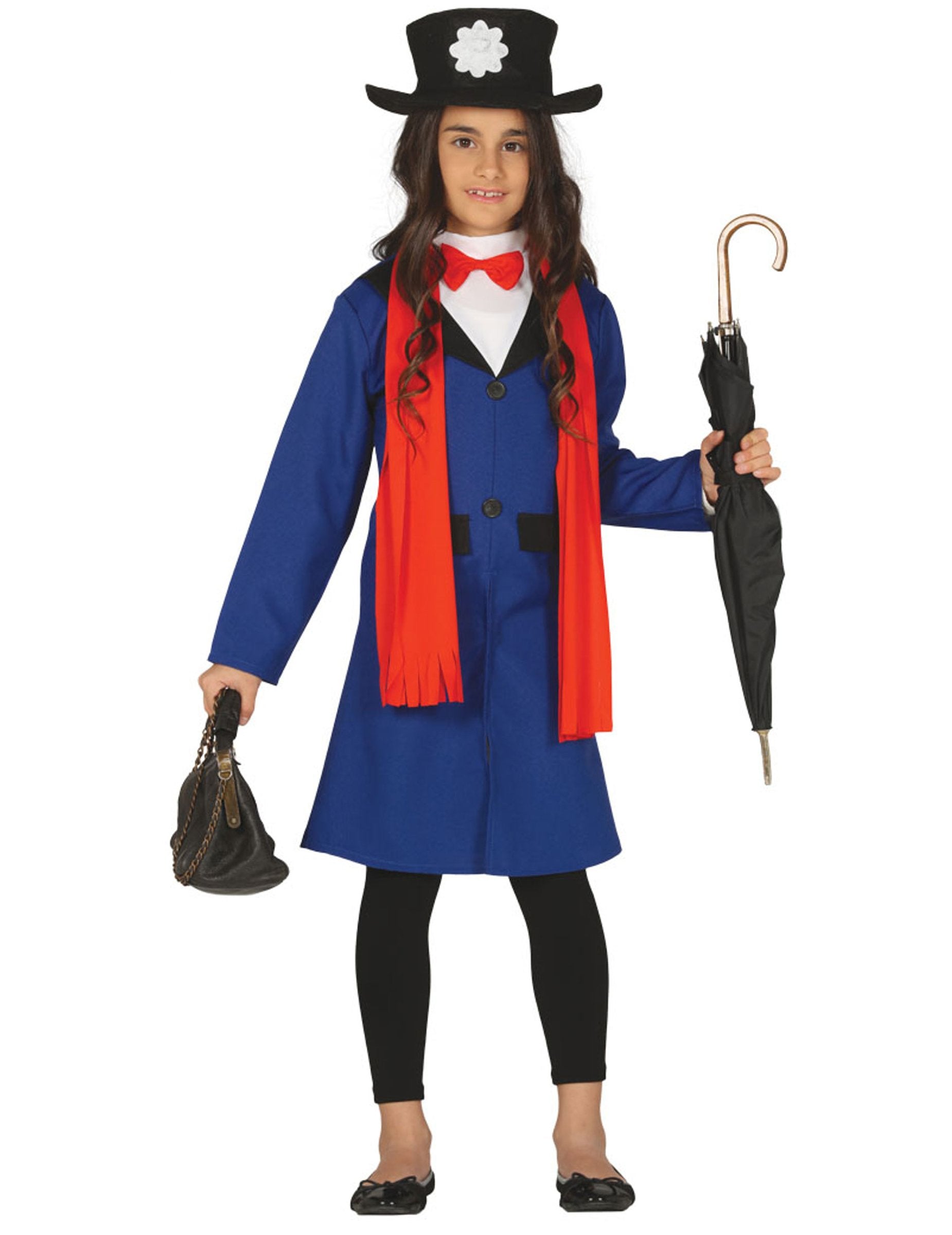 Този английски костюм на медицинска сестра за момичета се състои от яке, шал и шапка (чанта, чадър, панталони и обувки, които не са включени). Дългото яке е тъмно синьо с черната яка. Попълнен е от дълъг червен шал. Една шапка носи последния щрих на този костюм. Черно е с цвете отпред. Този костюм на английската медицинска сестра ще бъде идеален за карнавал или прикрита вечер.
