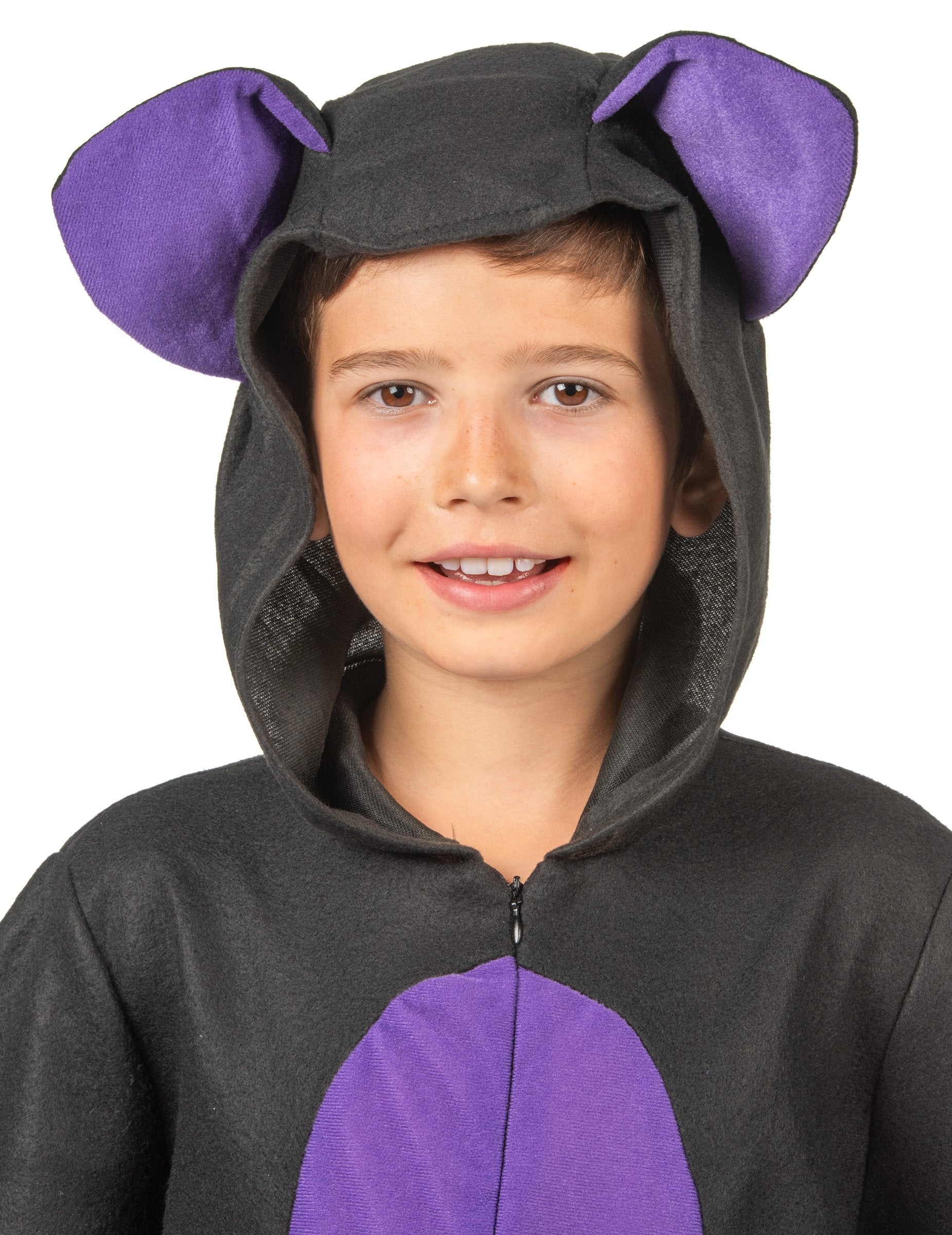 Този детски костюм на прилеп се състои от комбинация. Този е черен, с корема и лилавите крила. Тя също има качулка, с големи лилави уши. Тази маскировка ще бъде перфектна да бъде прикрита, докато е топла в Хелоуин вечер.
