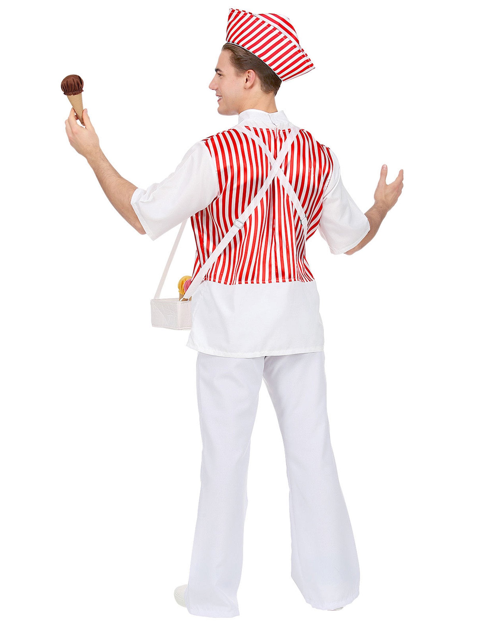 Кремът на продавача на костюми е за мъже, той се състои от риза с жилетка, вратовръзка, шапка и конична тава с 6 конуса сладолед. Ризата е бяла с фалшиви бели и червени ивици и фалшиви прозрачни пъпки отпред. Червеното се намира и на възела на пеперудите по обединен начин и на шапката също с бели и червени ивици, свързващи се с фалшивата жилетка. Конична тава с 6 конуса сладолед е доставена за перфектно аксесоари за костюма. Този продавач на сладолед ще бъде идеален за прикрито събитие.