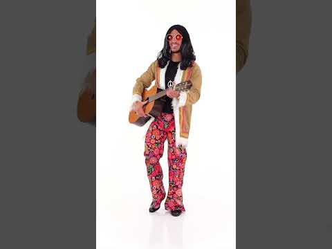 Тази хипи маскировка за мъже се състои от яке и панталони. Якето е цвят на пясък, с бяла изкуствена козина по краищата. Той е декориран с розова и жълта граница. Платените панталони са отпечатани с цветни шарки на черен фон. Този костюм ще бъде перфектен за игра на хипи по време на прикрита вечер.