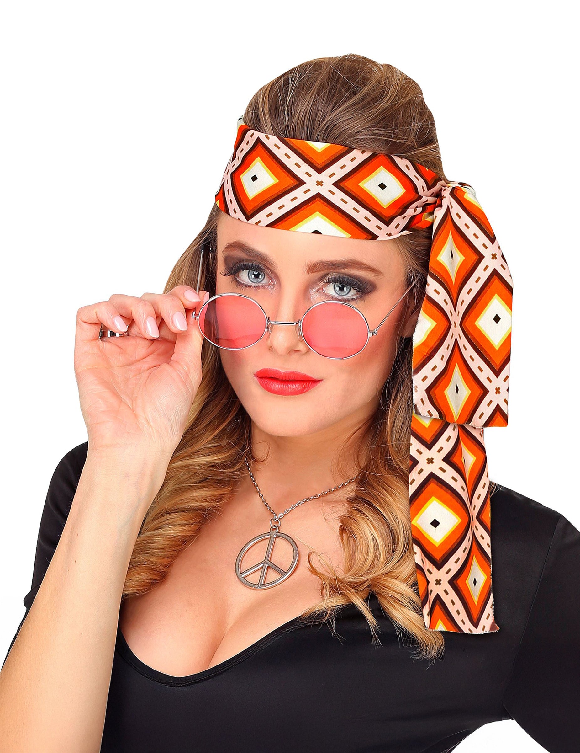 Този банер за възрастни е ясен, с диамантени щампи в тонове на жълто и оранжево. Той просто се свързва около главата си. Този банер ще бъде идеален за завършване на хипи или диско костюм за карнавала.