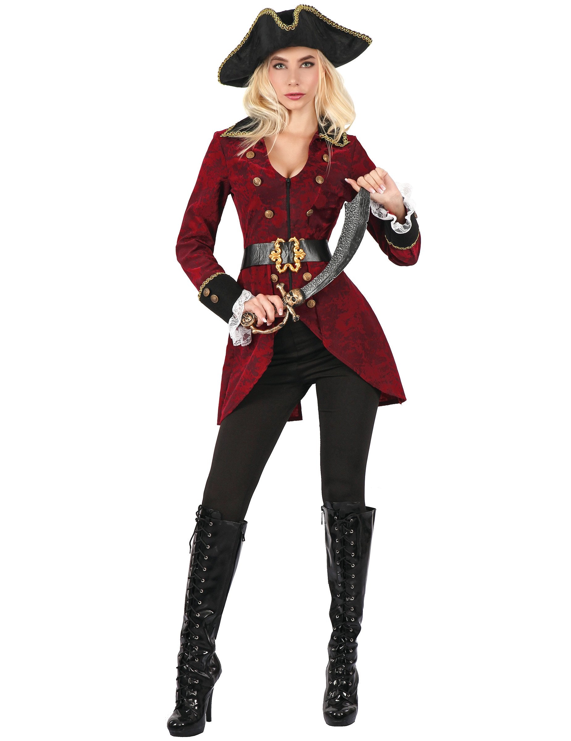 Тази пиратска маскировка за жени има яке, колан и шапка (нисък меч и ботуши не са включени). Пиратското яке е червено със златни копчета, ръкавите на ръкавите са черни. По -дълго е на гърба, отколкото отпред. Доста черен колан със златен цветен контур ще маркира вашия размер, като същевременно поддържа добре затвореното яке. Черна шапка със златни граници ще завърши този пиратски костюм! Тази маскировка ще бъде идеална за прикрита вечер или по повод карнавала!