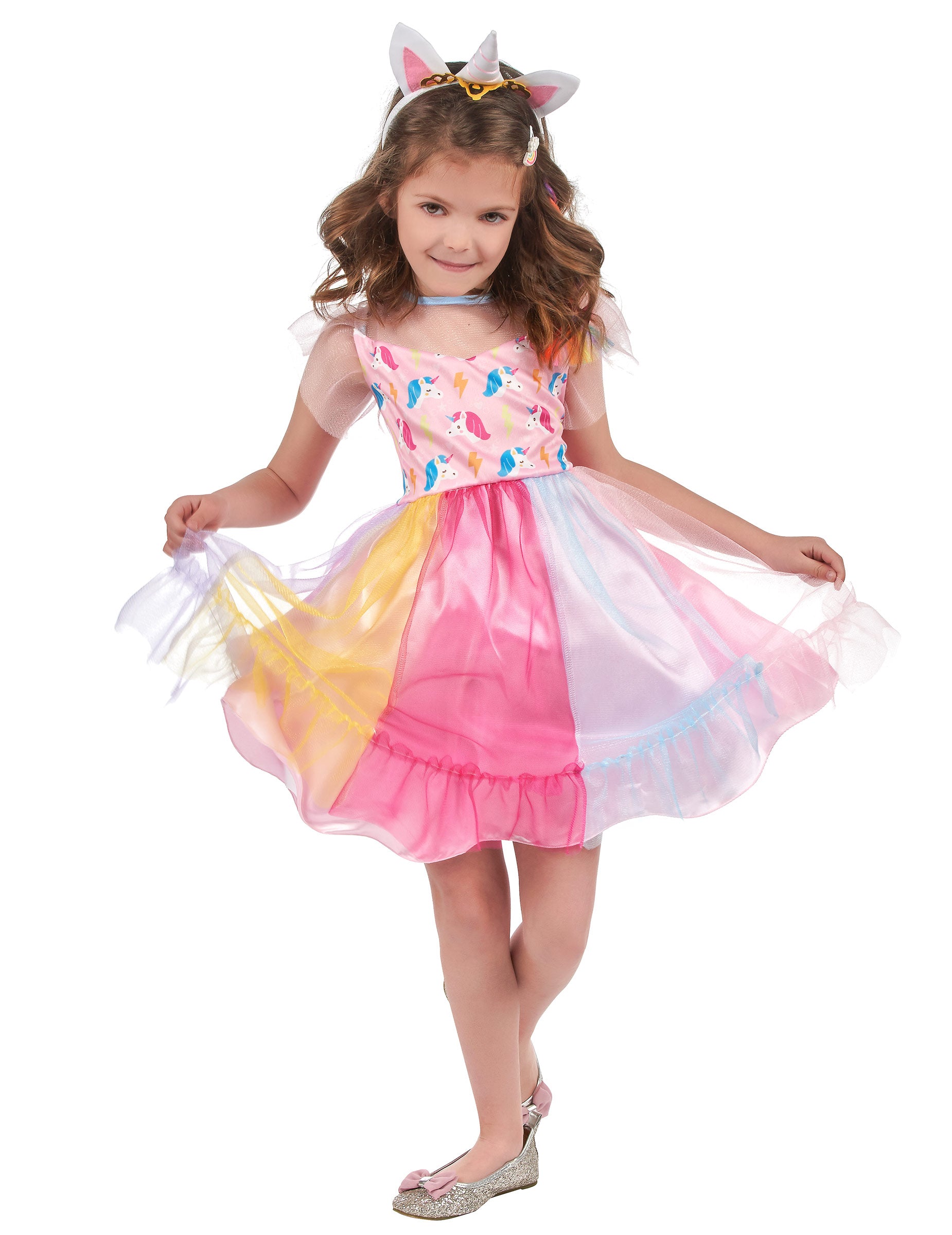 Този костюм за еднорог за момиче се състои от рокля и лента за глава (пръчка не е включена). Върхът на роклята е розов с глави на еднорози и мълния. Дъното на роклята е розово с фуста в цветно платно над нея. Лентата за глава е насочена към уши и рог в центъра си. Този костюм за еднорог ще бъде идеален за вълшебен рожден ден или за карнавал.
