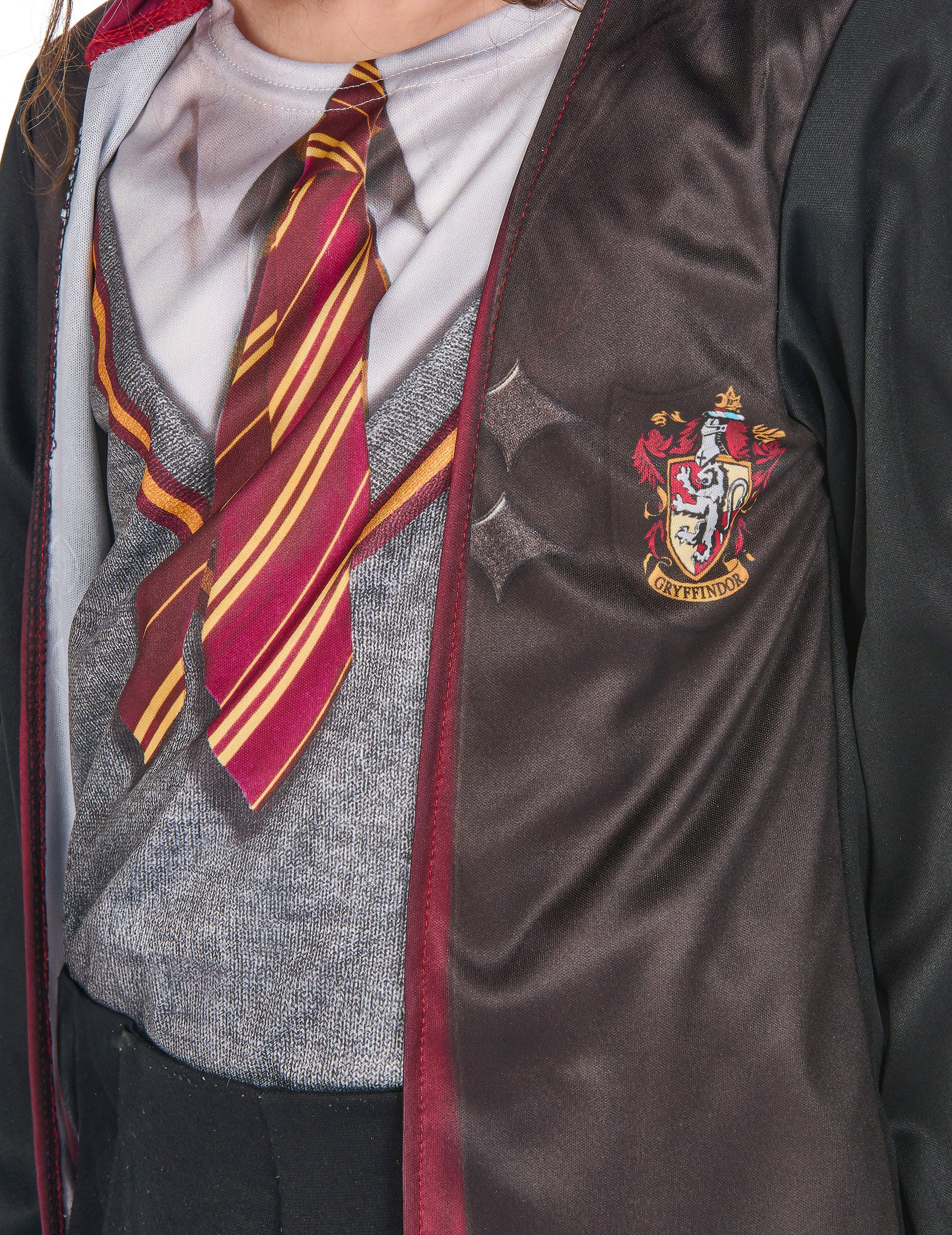 Това прикриване с аксесоари за деца на Хари Потър е под официален лиценз. Има рокля, багет и чифт очила. Роклята има щампа (вратовръзка, жилетка и яка на chemsie) на униформата на Грифиндор. Роклята е дълга и черна, идентична с тази, носена от Хари в Хогуортс. Пръчка и чифт кръгли очила (без корекция) ще завършат този костюм до съвършенство! Този костюм на магьосника Хари Потър ще бъде идеален да предложи фен на Училището за магьосници!