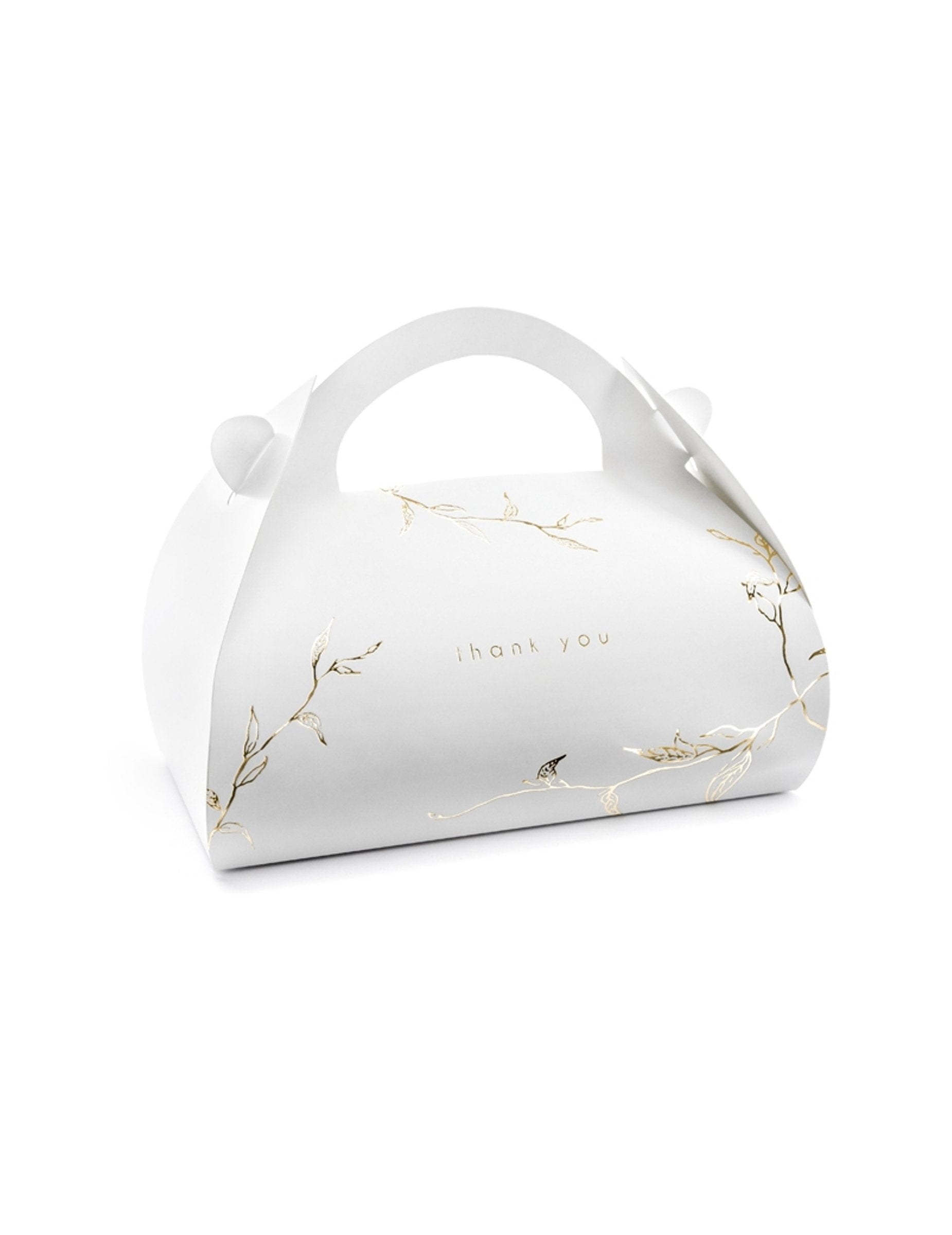 Cet ensemble comprend 10 boîtes à gâteaux en carton au design soigné. Chaque contenant mesure approximativement 16 x 8,5 x 9,5 cm. De couleur blanche, elles sont sublimées par des motifs de branches dorées et le message de remerciement "thank you". Ces boîtes sont dotées d'une anse de transport et se ferment aisément par pliage. Elles seront parfaites pour distribuer des gâteaux ou des douceurs à vos convives à l'occasion d'un mariage ou d'une fête élégante.