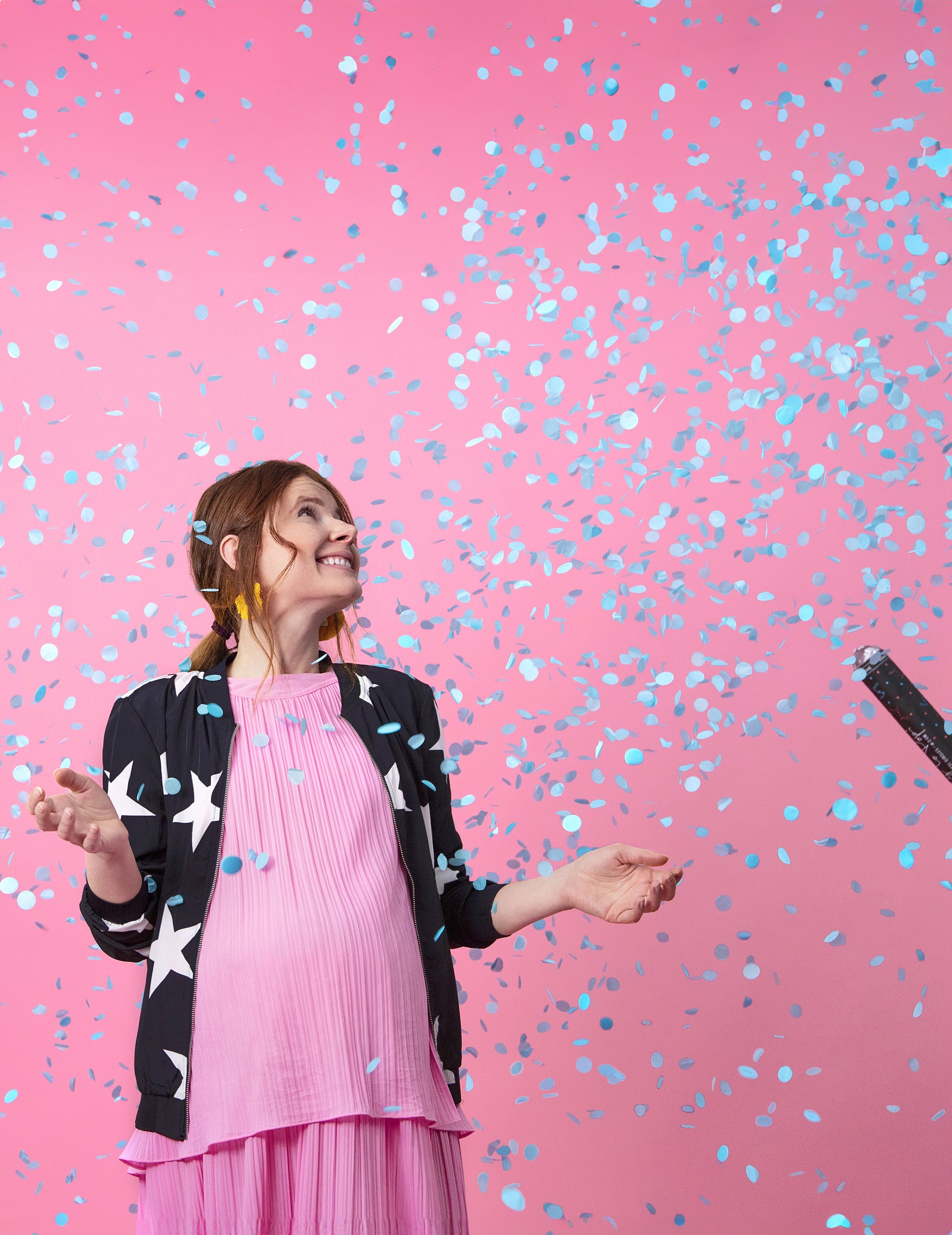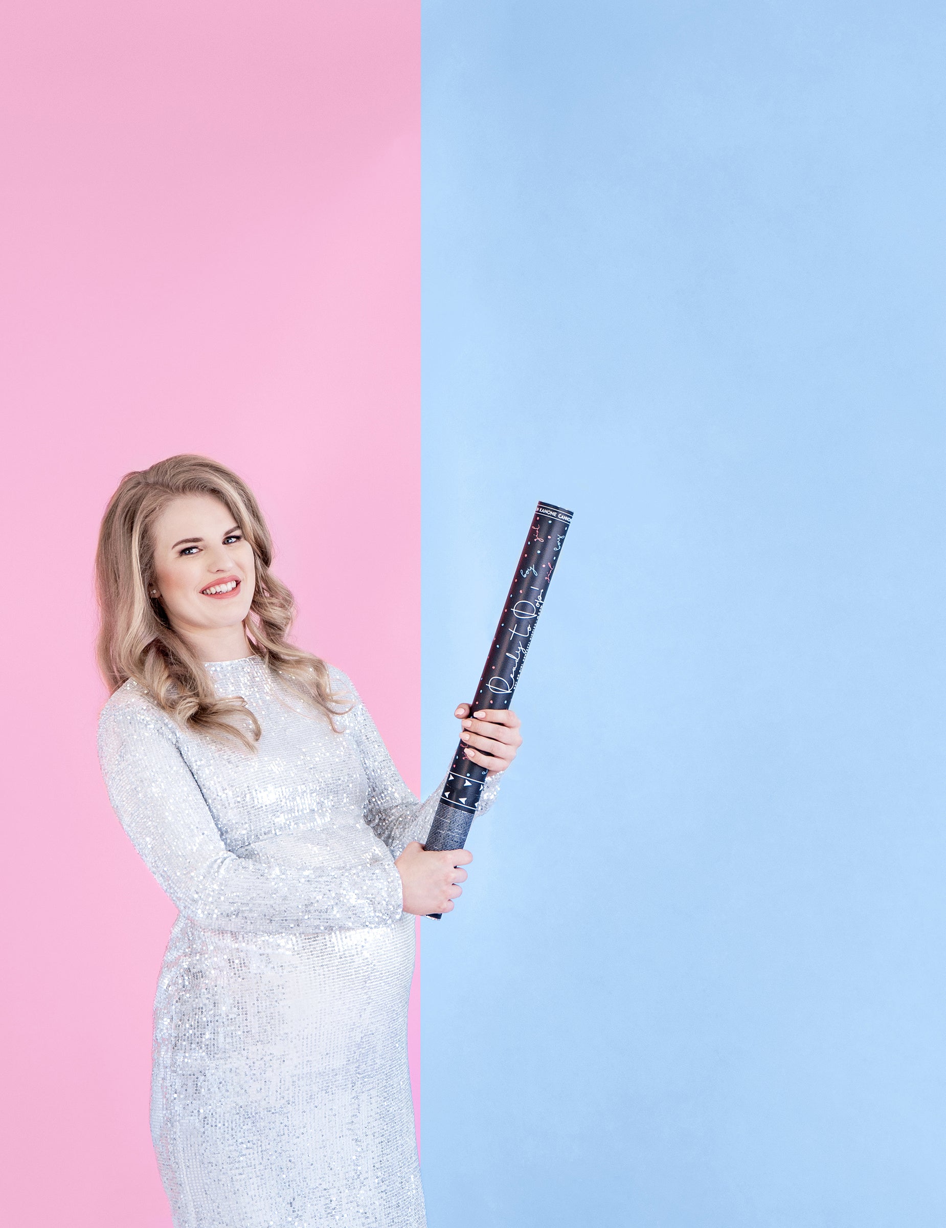 Това синьо оръдие на конфети е с дължина около 60 см. Просто обърнете основата на цевта, за да видите експлозия на сини конфети. Цветната тетация ще разграничи синята цев от розовото.