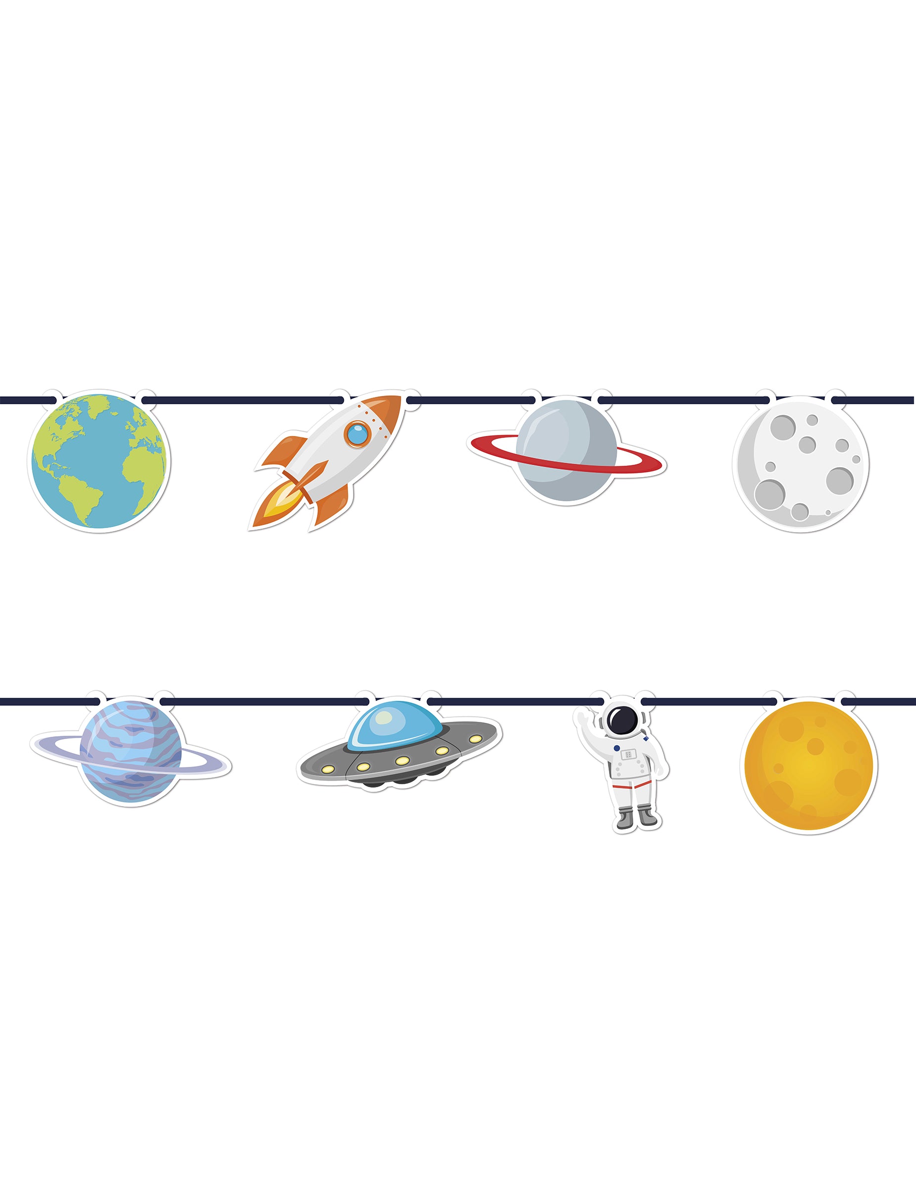 Добавете галактически акцент на вашето събитие с тази гирлянда с дължина 2 м. Тя се състои от няколко картонени вињетки от 16 cm, изобразяващи планети, ракета, астронавт и други небесни елементи. Тази висяща украса е идеална за завършване на парти декорация за рожден ден на космическа тематика.