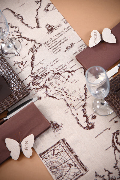 Украсете приема си с елегантност благодарение на това пътека за маса изработена от памук, дълга 3 м и широка 28 см cm. Илюстрирано с превъзходен карта на света Като представя различни страни и океани, той кани към изследване. пътека за маса е основният аксесоар за завършване на сватба с тема пътуване или всяко празнично събитие, фокусирано върху приключения.
