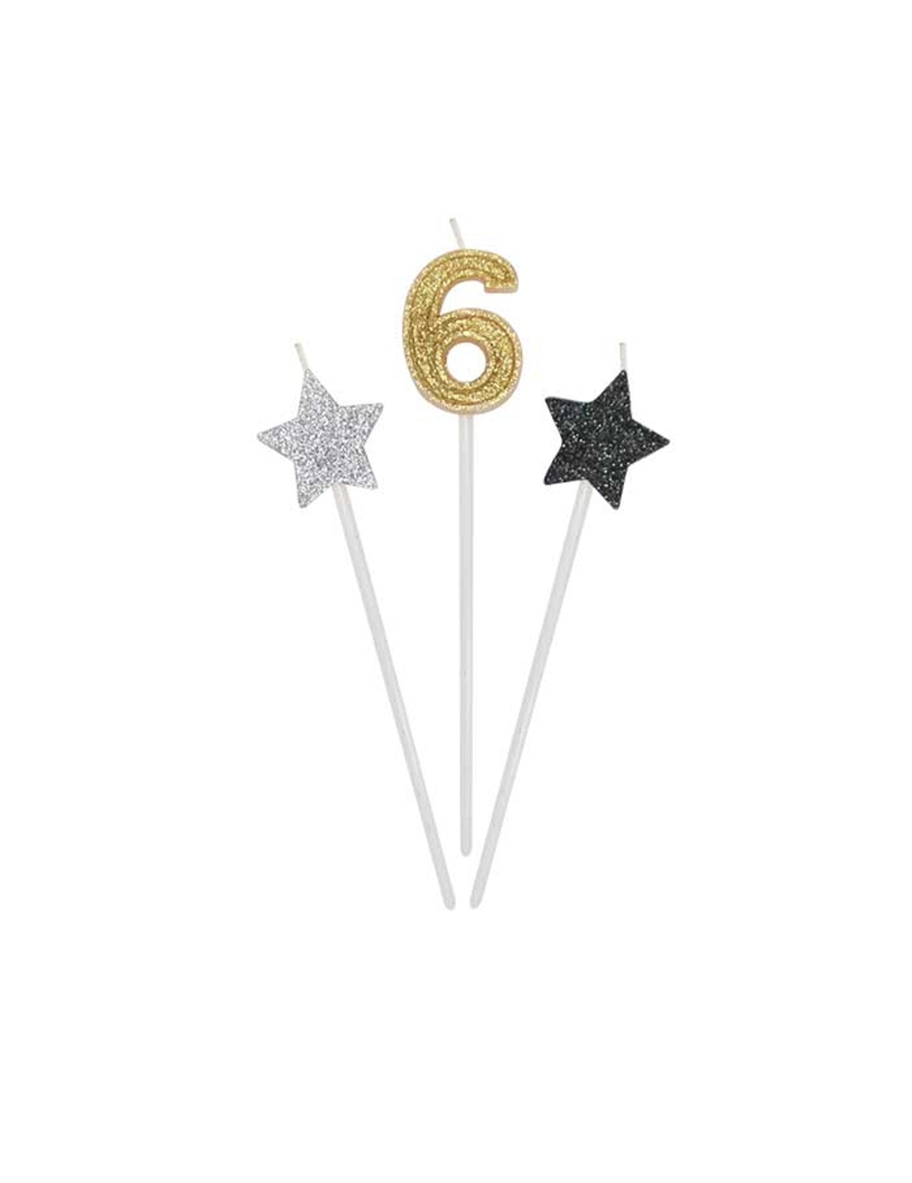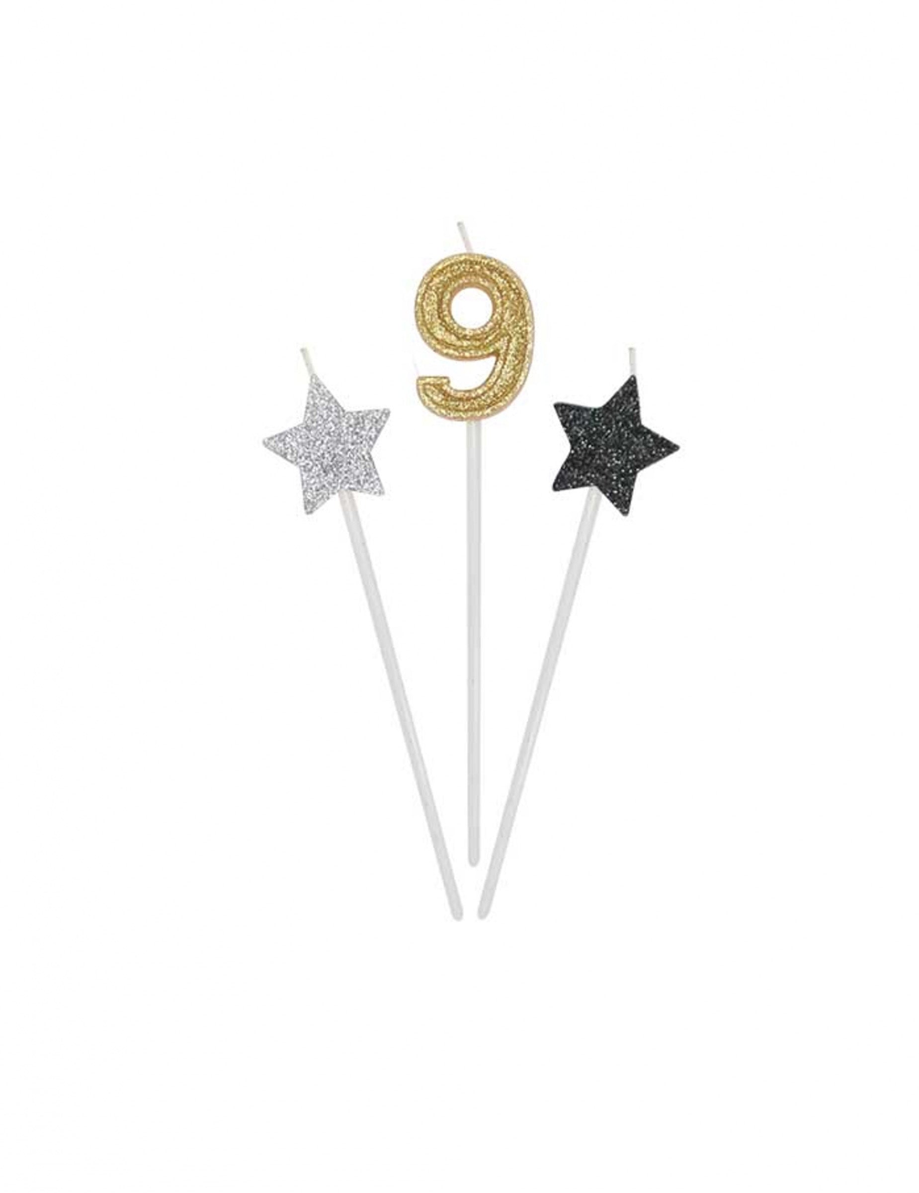 Този жребий се състои от 3 свещи за рожден ден. Те са високи приблизително 16 см. Ще имате свещ със златна фигура, сребърна звезда и черна звезда. Този набор от свещи ще бъде идеален за завършване на декорацията на вашата торта за рожден ден.