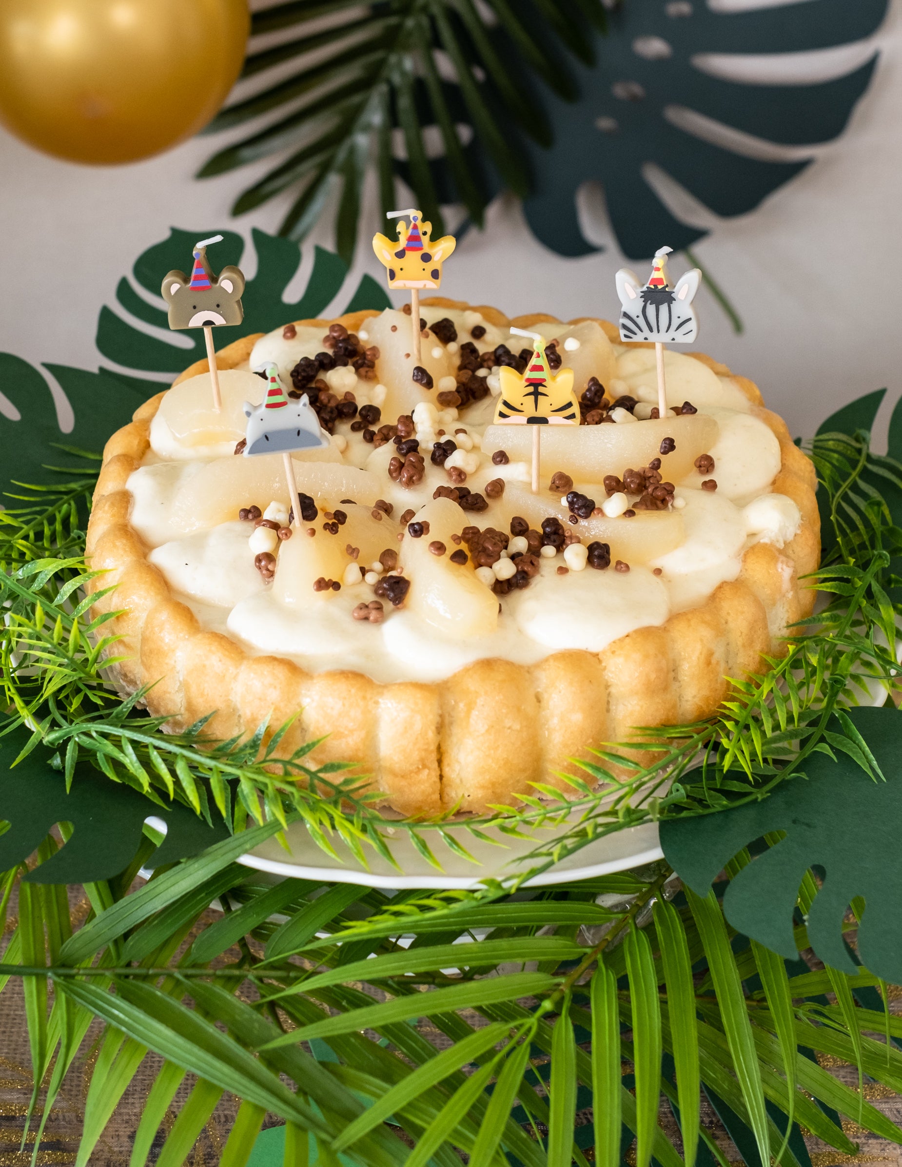 Тези свещи за животни на върха се продават в комплект от 5. Те измерват приблизително 2,5 х 2,5 см. Животните са представени, носещи празнична шапка: жираф, мечка, хипопотам, тигър и зебра. Украсете тортата си за рожден ден с тези свещи за тема за сафари!