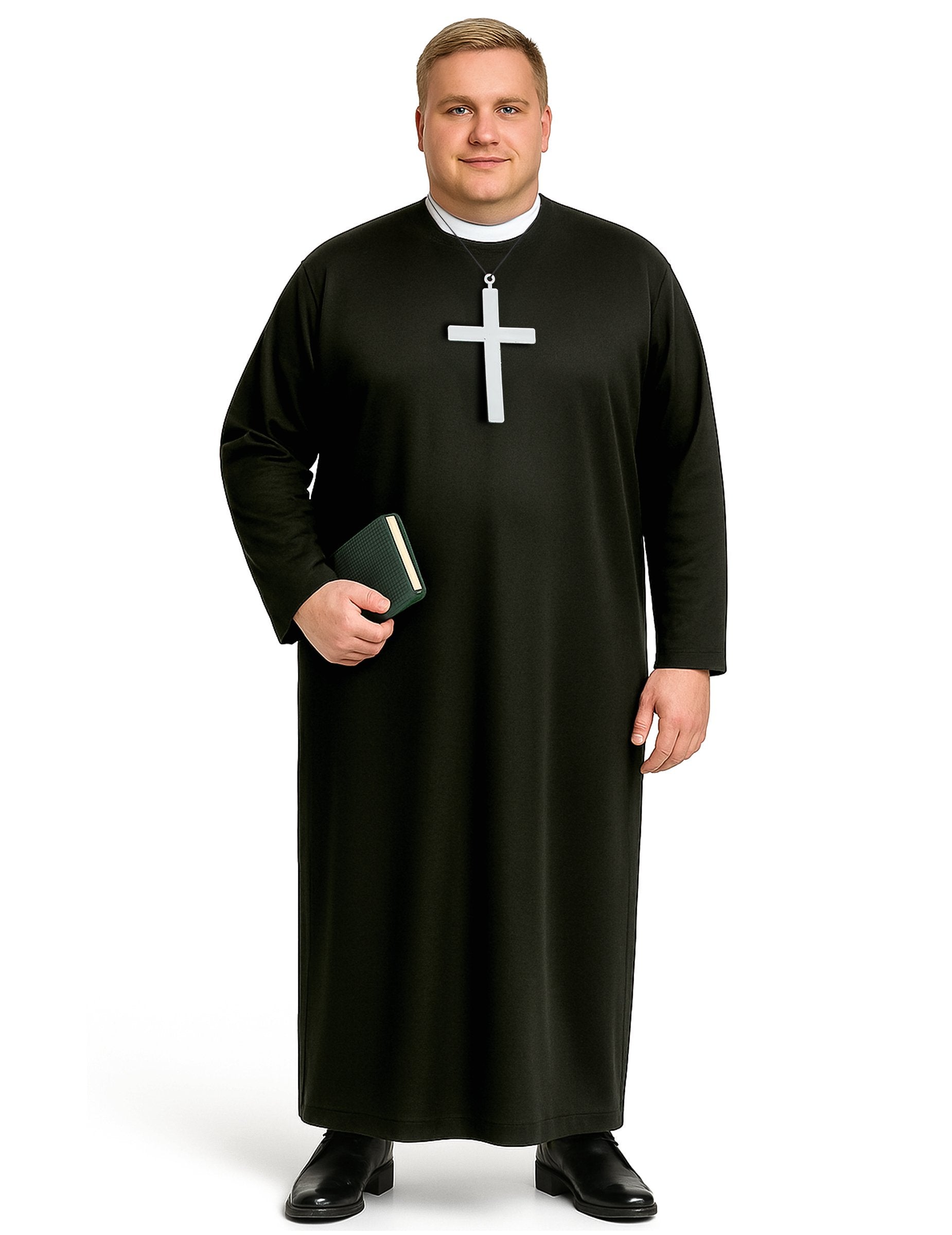 Костюмът на този голям свещеник е за мъже. Състои се от рокля (яка и книга не са включени). Дългата рокля е черна, с бяла яка. Драскост присъства в горната част на гърба, за да се затвори лесно роклята. Тази маскировка ще бъде идеална за карнавал или вечер, прикрита с приятели.