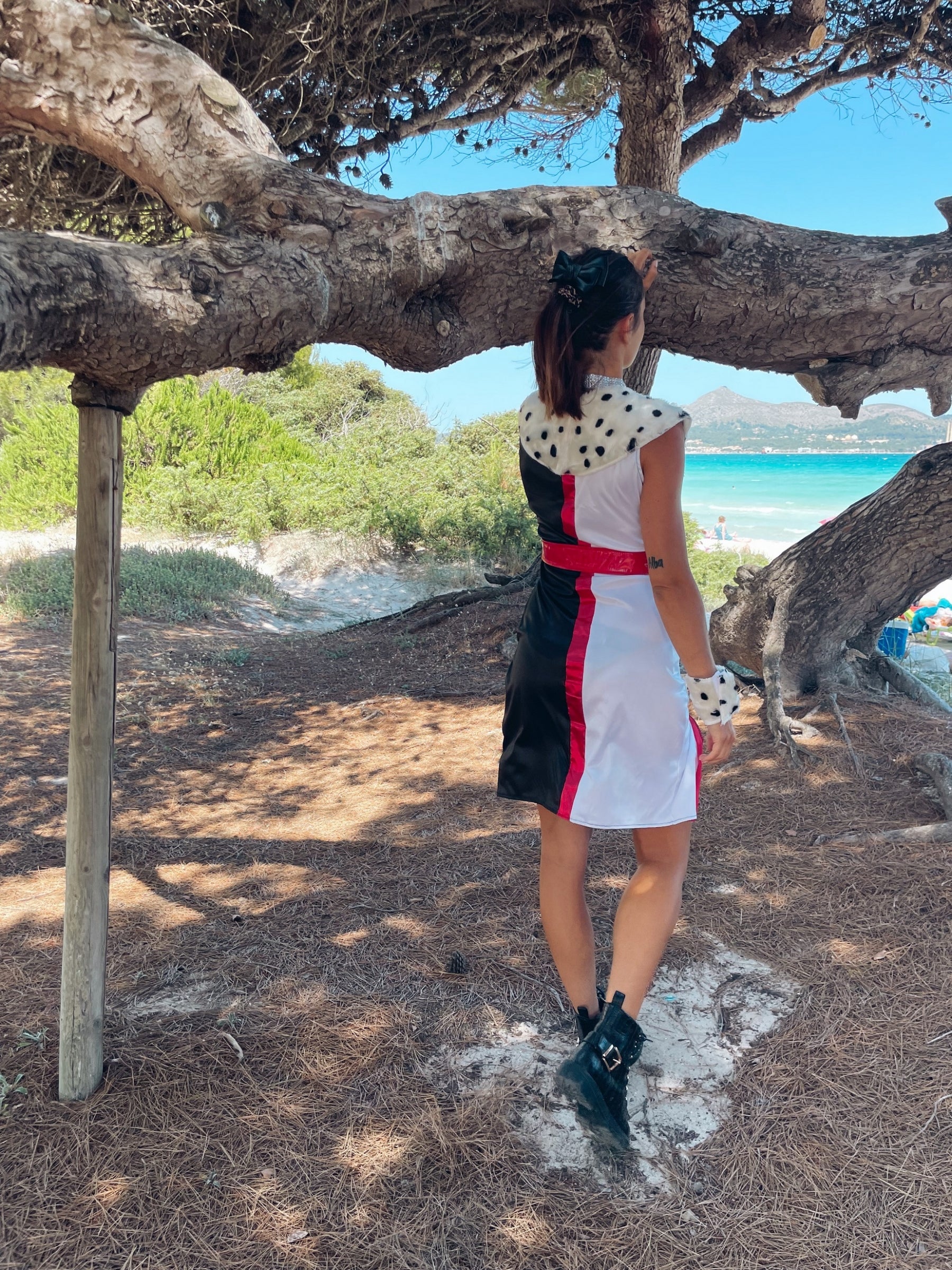 Роклята е от изкуствена кожа с кантове от далматинска кожа по реверите. Тоалетът има дълбоко V-образно деколте. Има цепка отстрани, стигаща до средата на бедрото. Червен кант подчертава тази цепка.