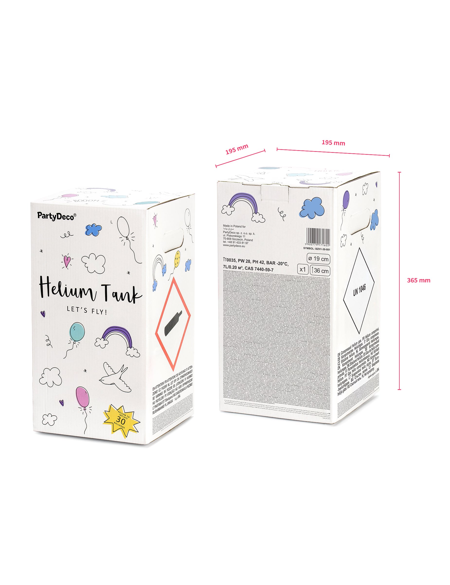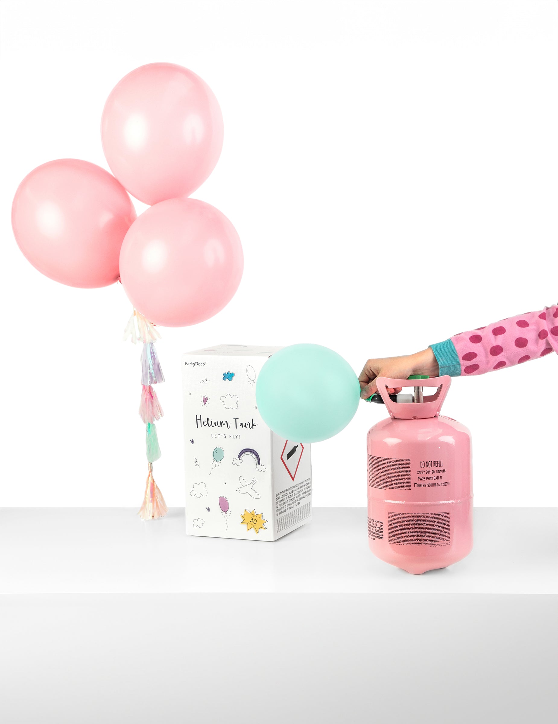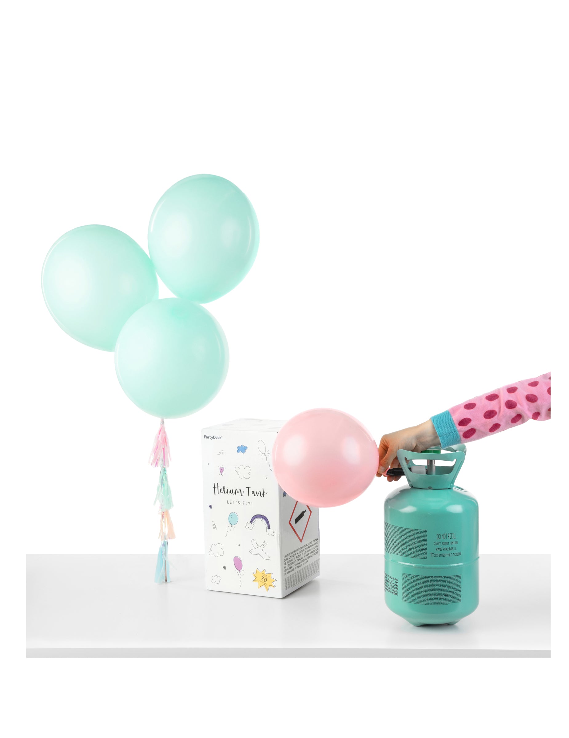 Опростете инфлацията на вашите балони с тази бутилка хелий, която може да надуе до 20 балона. Съвместим с латекс и алуминиеви балони, той се предлага с клапан, който използва интуитивен и бърз. Инструкциите са ясно посочени на картона за лесна работа. Продължителност на флотацията на латексни балони: около 6 до 7 часа при идеални условия. Алуминиеви балони: стайна температура, те могат да останат в окачване до седмица. Фактори, които трябва да се вземат предвид: Размерът на балоните, тяхното качество и околните условия (топлина, влажност) могат да повлияят на тези продължителни. Съвети за по -добра употреба: Надуйте ги умерено, за да ограничите риска от спукване и запазване на вашия хелий резерват. Как да рециклирам бутилката? След като се изпразни, бутилката може да бъде поставена в контейнера за сортиране (кошница или жълта торбичка) или докладвана в център за рециклиране. Преди да го изхвърлите: Уверете се, че е напълно изпразнен. Извадете клапана. Бутилката има капацитет 0,14 м3. Брой балони, които могат да бъдат надути (като индикация): латексни балони: диаметър 23 cm : 20 балона диаметър 25 cm : 12 балона диаметър 38 cm : 9 алуминиеви балона: диаметър 45 cm : 10 балона диаметър 50 cm : 5 балона