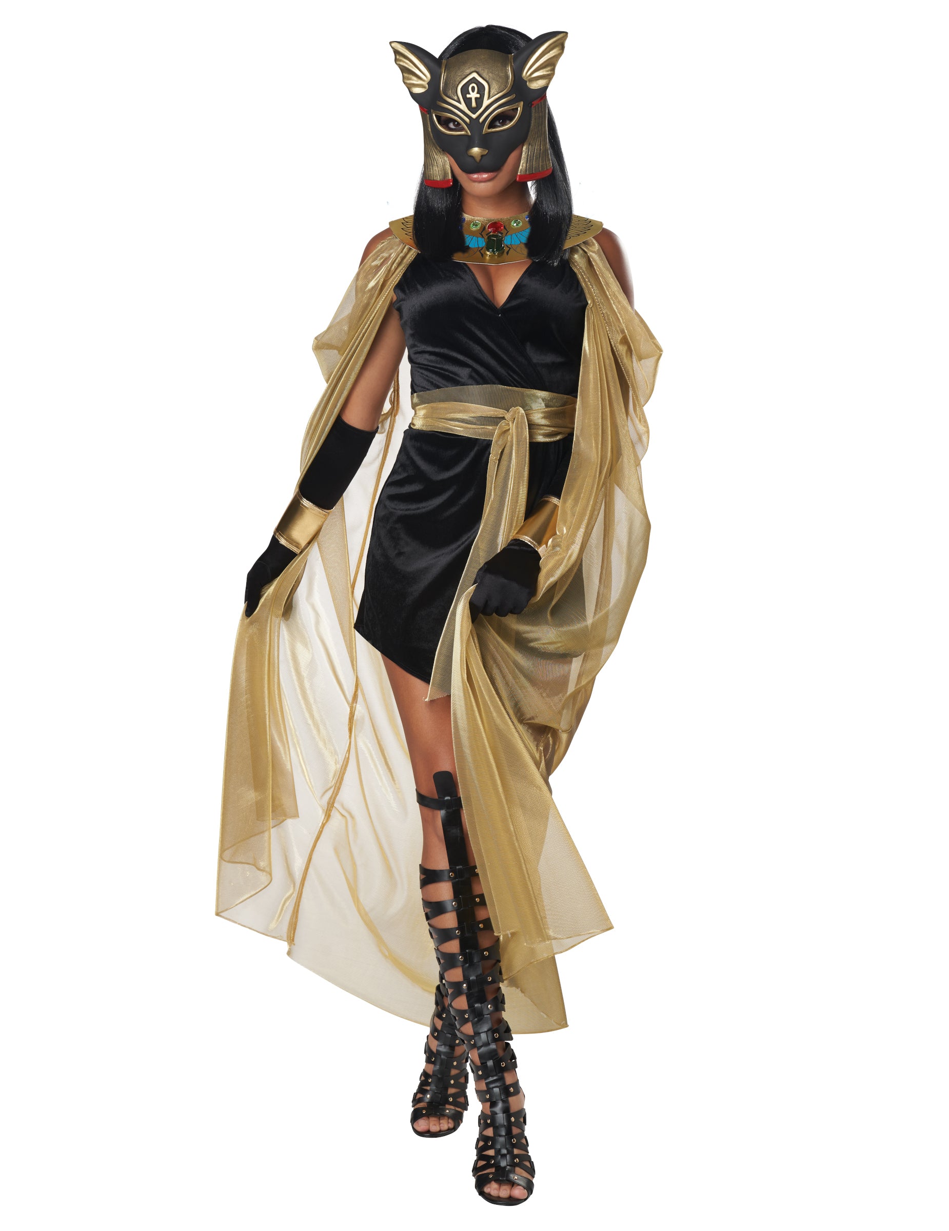 Този костюм на котешка богиня за жени се състои от рокля, яка с нос, колан, маска и ленти (ръкавици, скиптър и обувки, които не са включени). Кратката рокля е черна. Той има хубаво V деколте. Широката шия е златиста с бръмбар в средата и фалшивите камъни. На яката е фиксирана нос. Той е направен от златно платно. Маската представлява богиня за чат глава. Той е черно и златист, с отвори на нивото на очите. И накрая, лентите за ръка завършват този костюм. Те са златни и близо до драскотини. Този костюм ще бъде идеален да ви отведе за богиня на древен Египет по време на прикрита вечер.