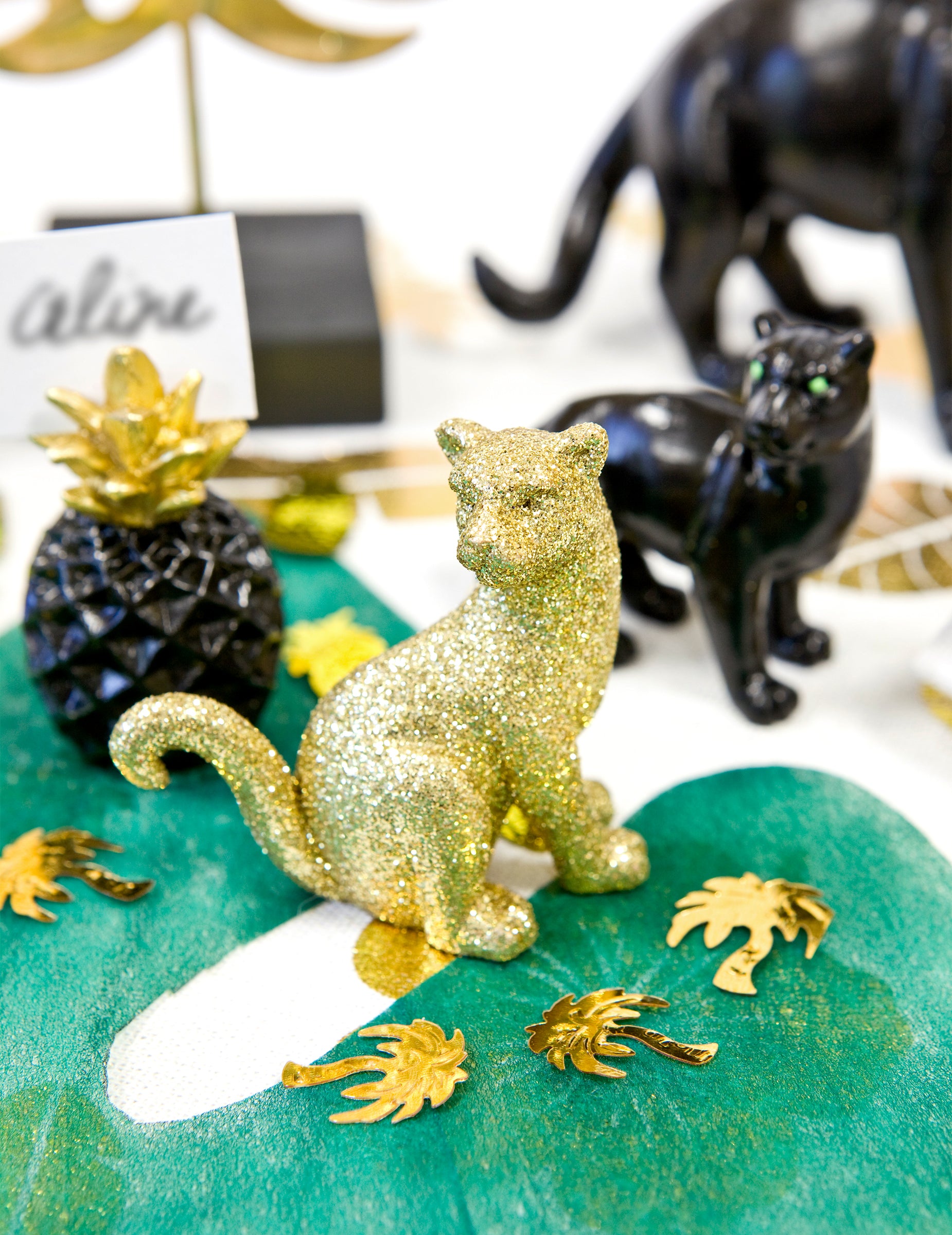 Украсете масата си с тази фигурка от пантера Седалка с изискан дизайн. Изработена от смола, тя е украсена с блестящи пайети и е с размери приблизително 6 cm. Интегрирайте това златна пантера към вашата сценография, за да създадете шикозен тропически декор и оригинален.