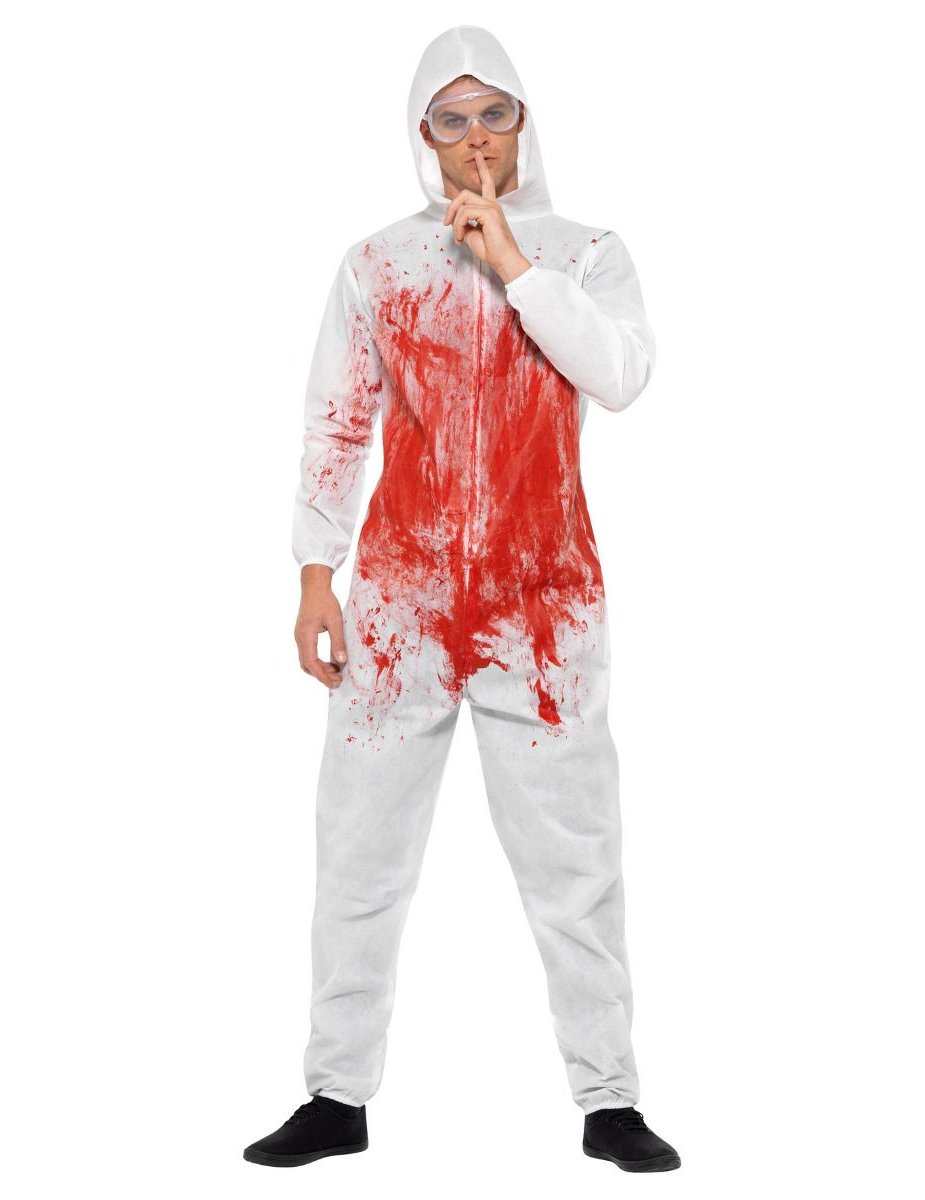 Този костюм за възрастни се състои от комбинация и чифт очила. Тази бяла комбинация има кръвни петна отпред. Той е дълъг и има качулка отзад. Прозрачните очила ще завършат този сериен костюм на убийците. Перфектната комбинация, за да плашите вашите близки по време на Хелоуин!
