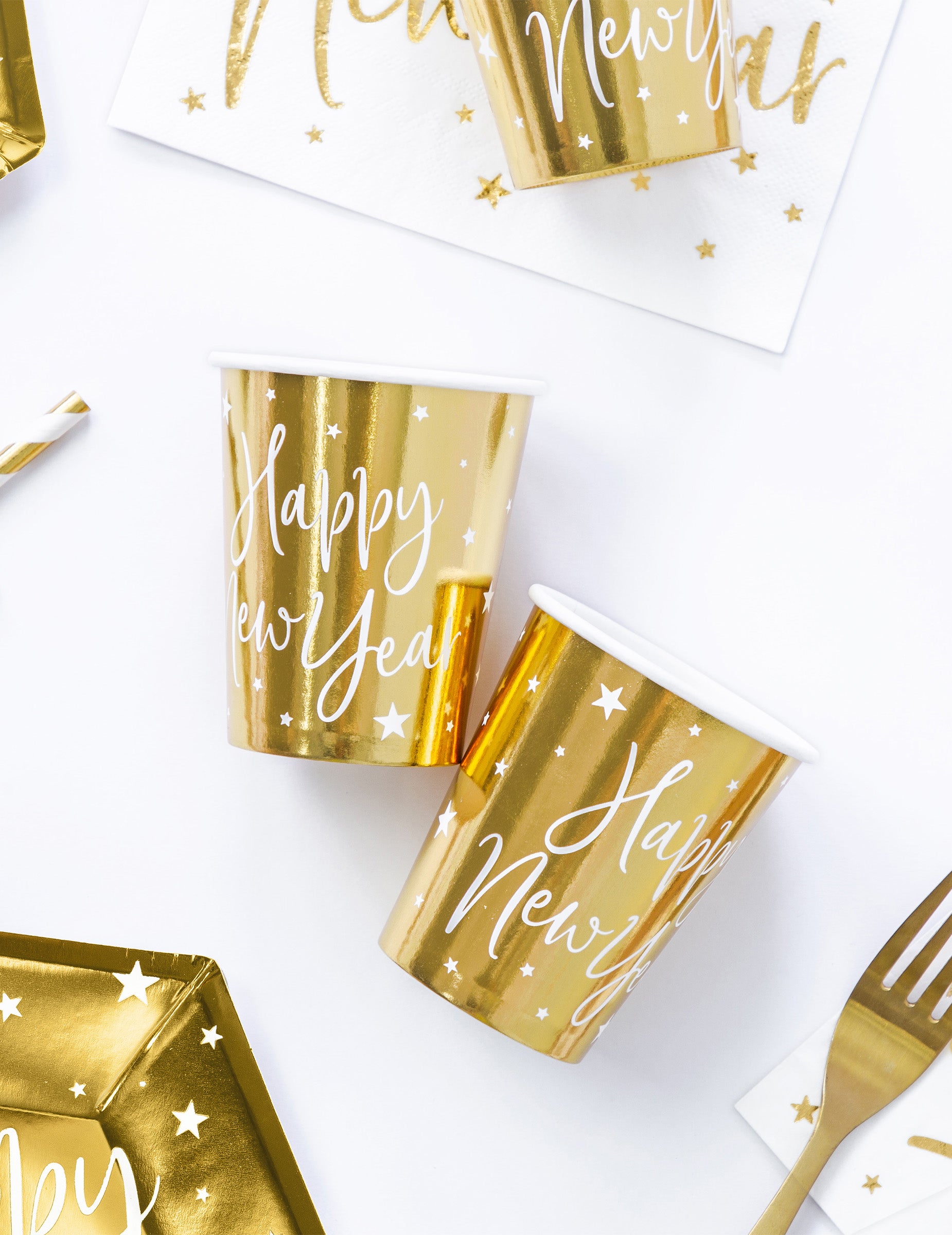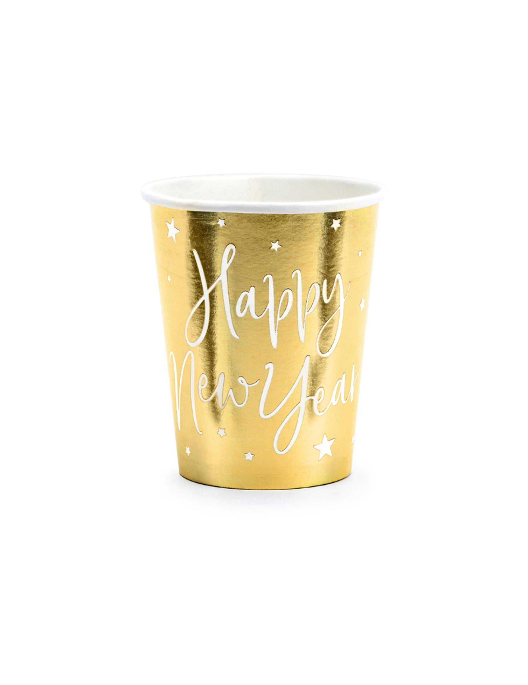 Подобрете декорацията на вашето парти с този комплект от 6 броя чаши картонени бутилки с вместимост приблизително 220 мл. С елегантно метално златно покритие, те са илюстрирани с нежни звезди и надпис „ Честита Нова Година! контрастират в бяло. Тези чаши са идеалният аксесоар, който ще внесе шикозна и искряща атмосфера на вашата маса. Нова година.