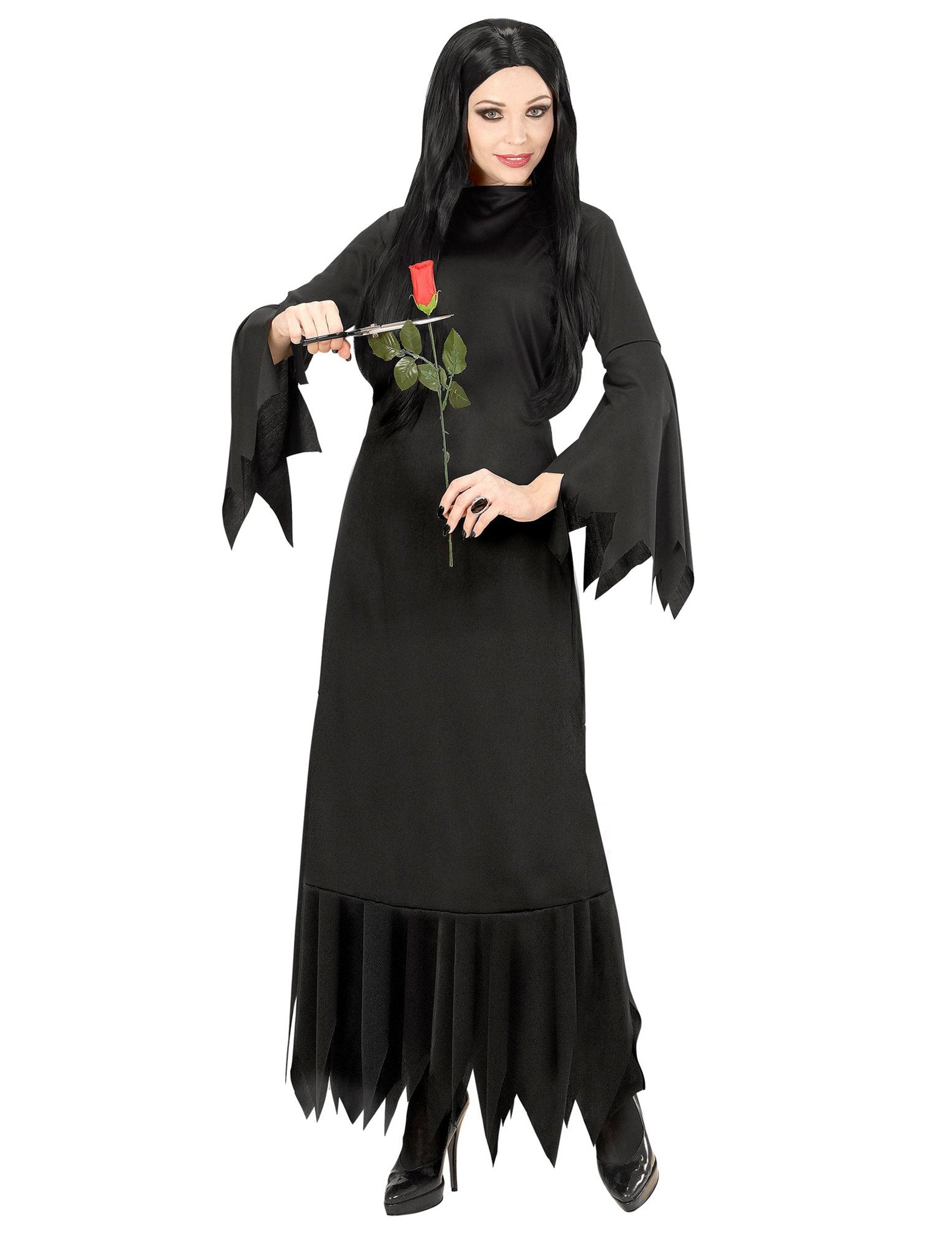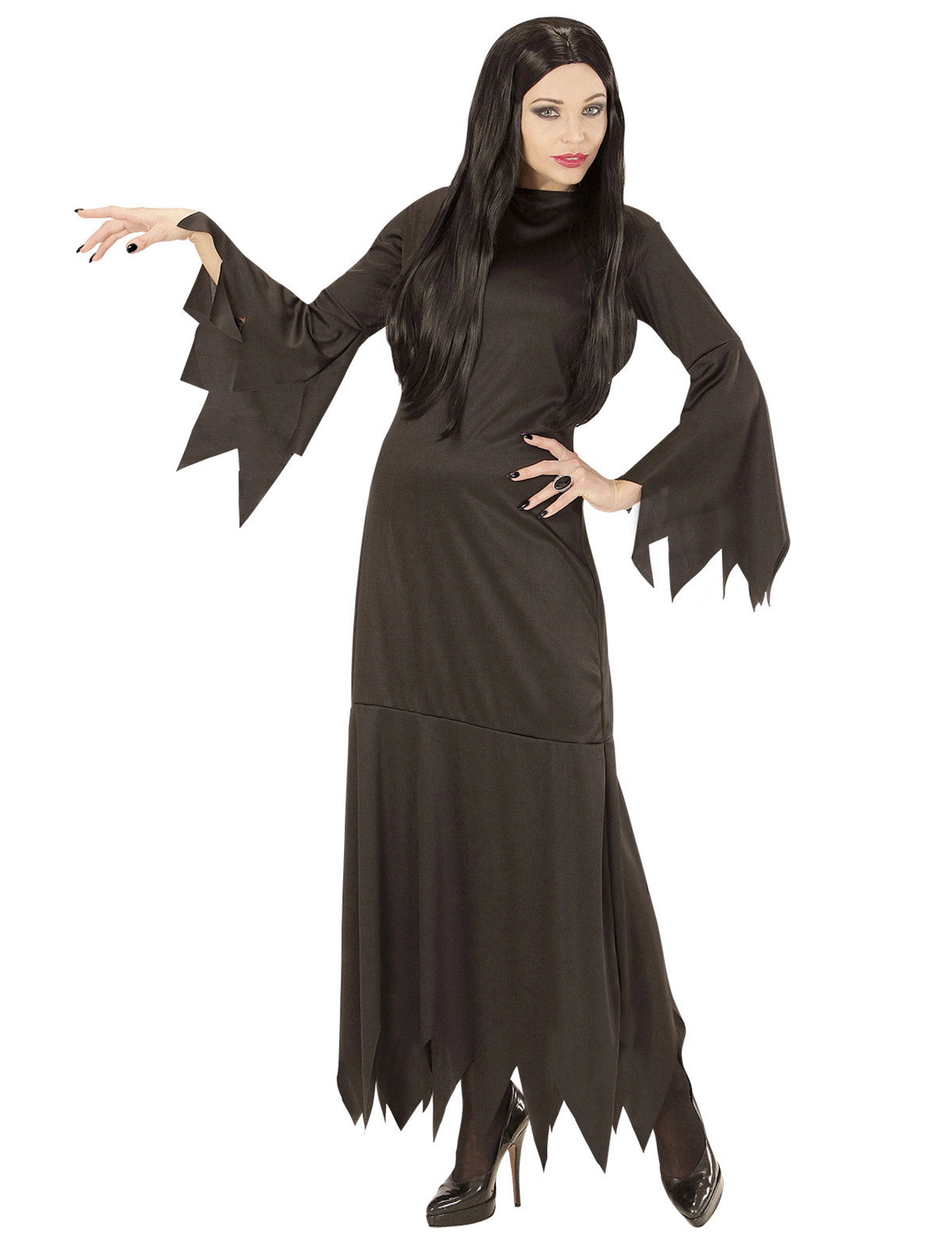 Този костюм на готическата жена за жени се състои от рокля (аксесоарите не са включени). Роклята е черна с дълги разпалени ръкави. Всеки край на роклята завършва в трион. Този костюм ще бъде прост и ефективен, за да имате добра вечер по време на прикрито парти.