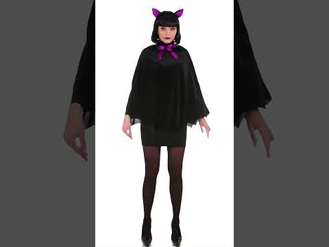 Тази бухалка с качулка е за жени. Той е черен с лилава папийонка в яката и лилавите уши на главата. Дъното на пончото имитира формата на крилата на прилеп. Той ще бъде идеален за костюм на прилеп за Хелоуин.