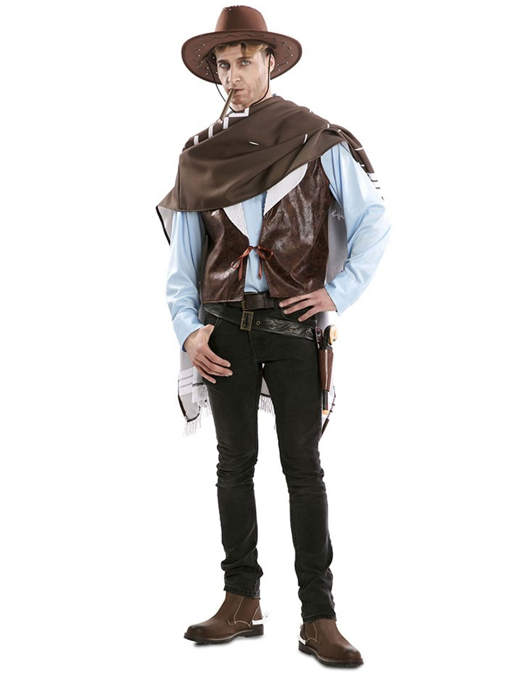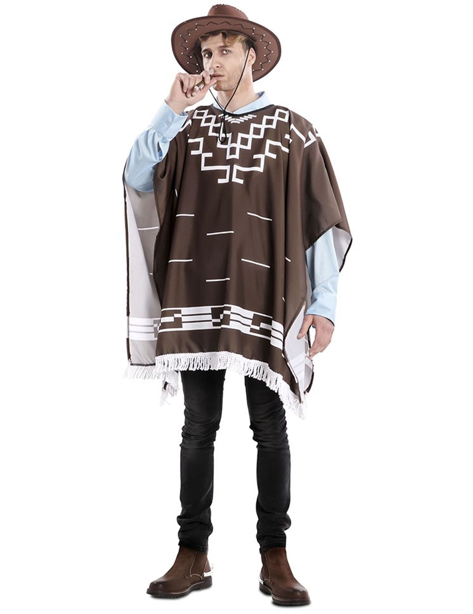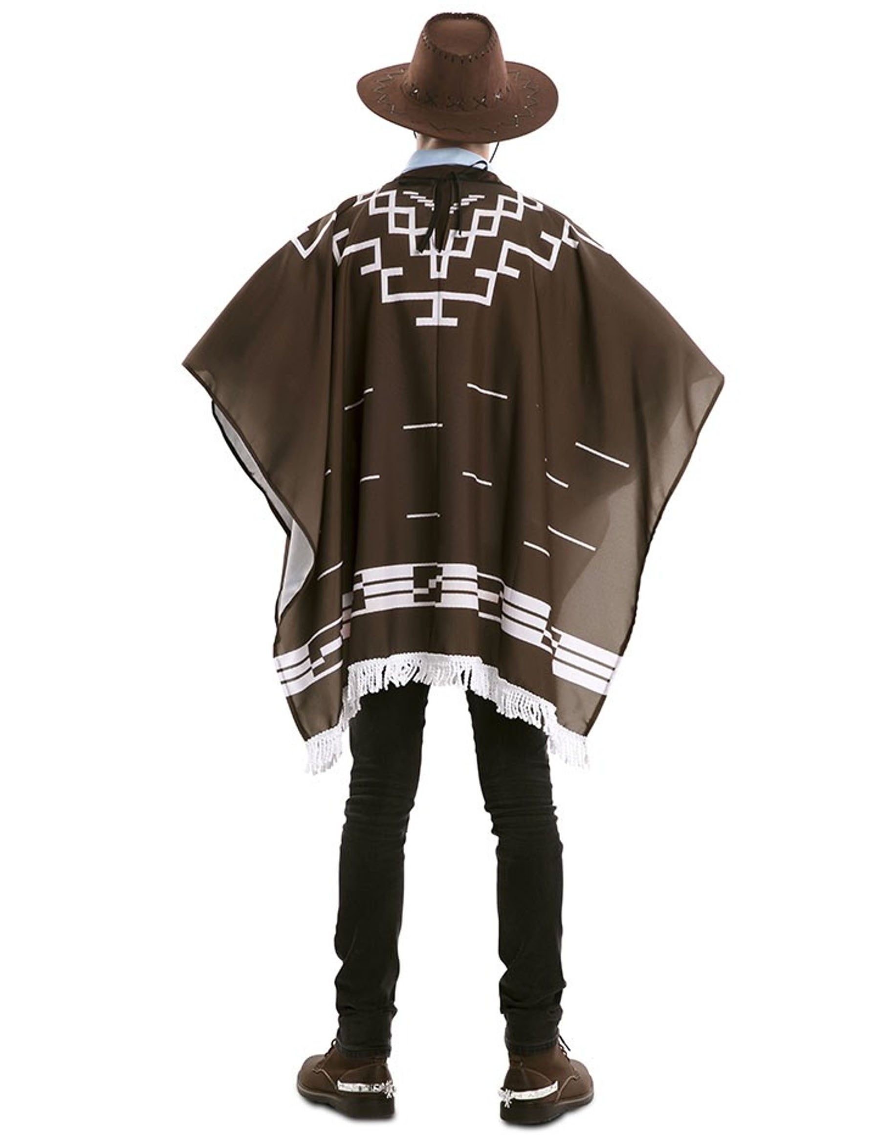 Този каубой маскиране извън закона за мъжете има жилетка и пончо (шапка, колан, оръжия, риза и панталони, които не са включени). Пончото е кафяво на цвят с бели геометрични модели и бели ресни. Той си спомня известни западни филми. Жилетката е в кафява тъкан аспект на звяра с яка в имитеон бяла овца вълна. Малка кафява панделка ще ви позволи да затворите тази жилетка. Този костюм за захващане на западните мъже ще бъде идеален за западна тема вечер или за филмови герои.