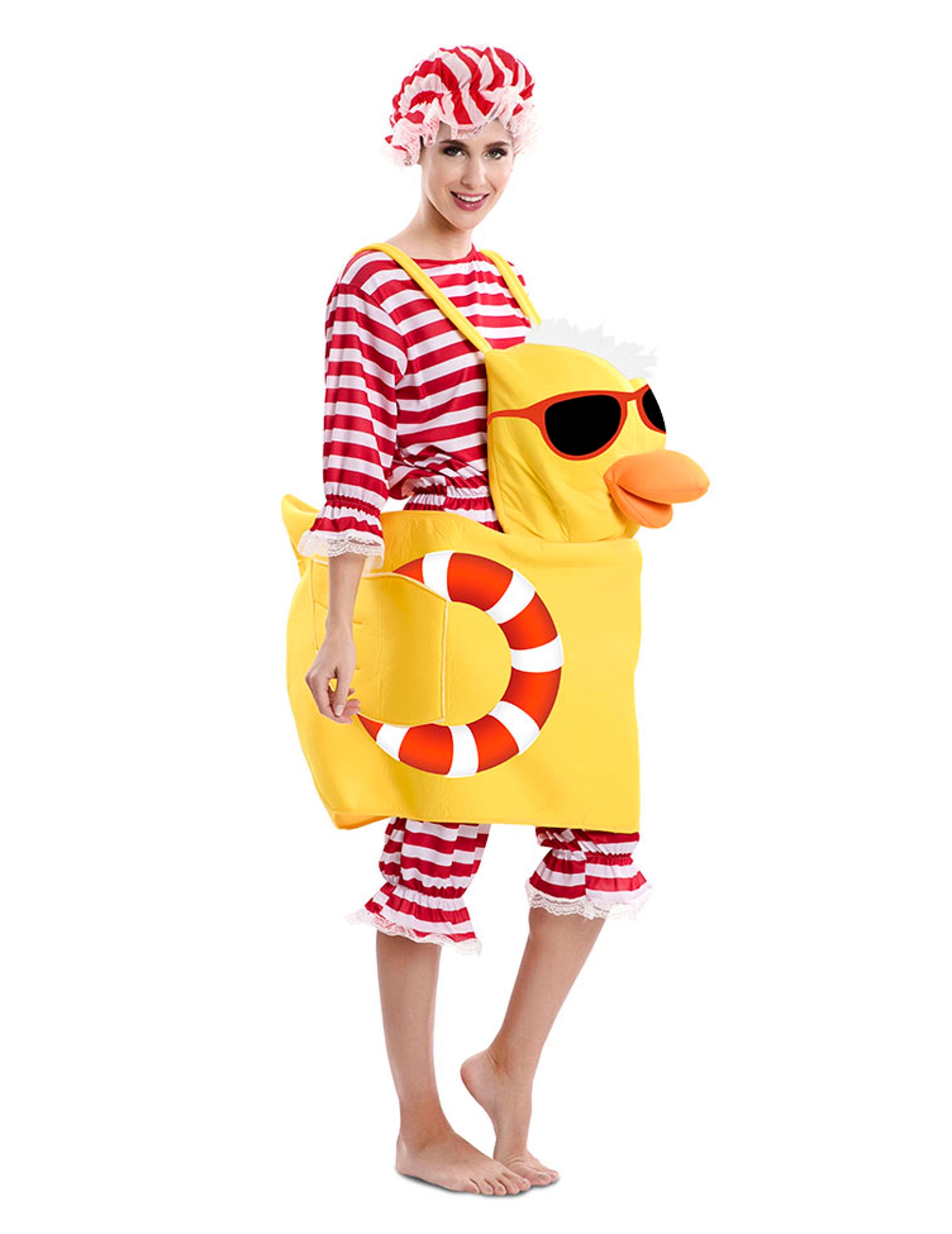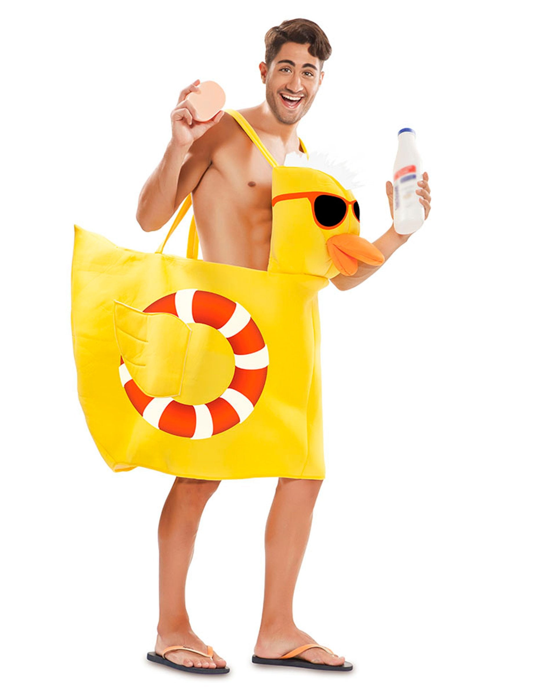 Тази маскировка за възрастни патици има комбинация със суспендии, продавани самостоятелно. Комбинацията е във формата на жълта патица за баня с житейска буйла и чифт слънчеви очила. Sourss се пришиват в комбинацията, за да я поддържат на място. Лигавицата от пяна помага да се поддържа формата на този костюм за баня с патица. С този костюм изберете хумор по време на прикритите ви вечери или карнавал.
